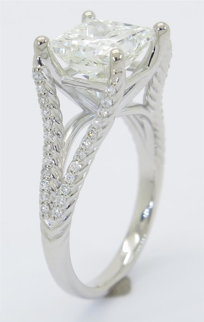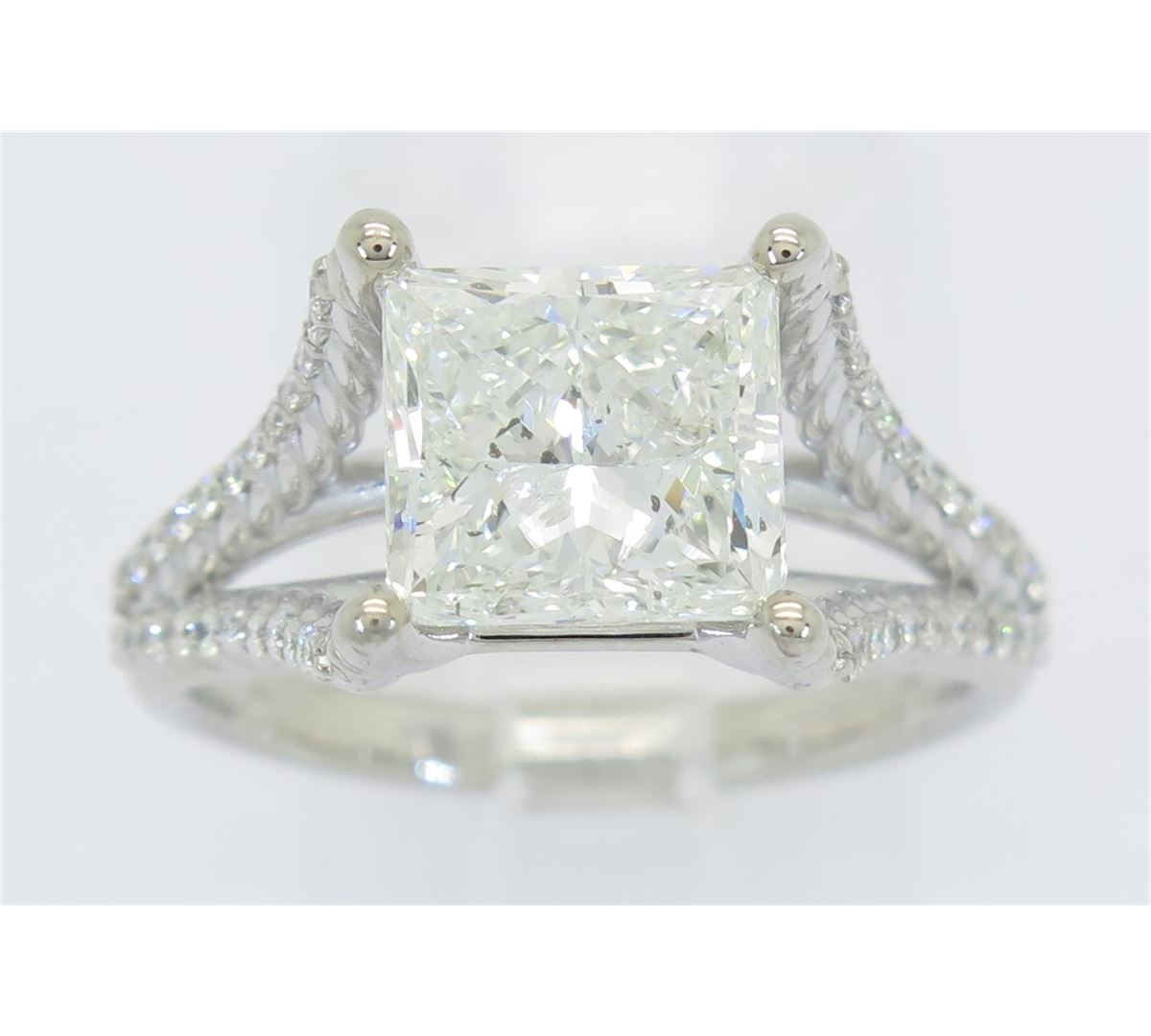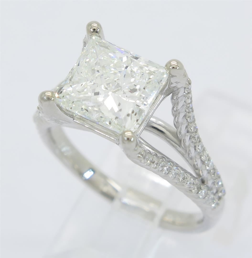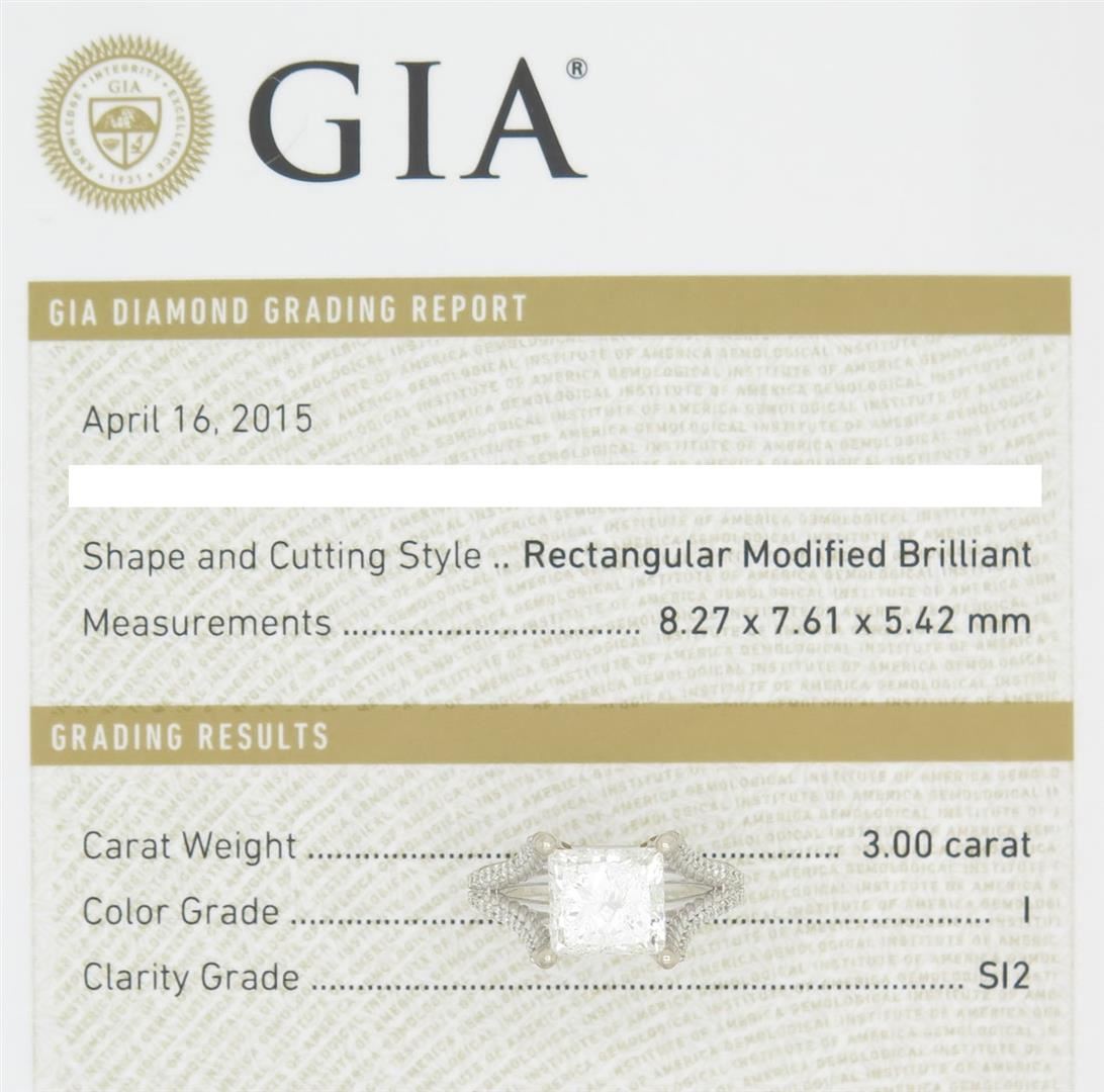 One tested 14K white gold diamond ring. Containing: One GIA Certified Princess Cut Diamond, Size: 3.00CT, Clarity: SI2, Color: I. 48 Round Brilliant Cut Diamonds. Approximate total diamond weight: 3.25CTW. All diamonds are graded in the mounting unless otherwise stated. Weight of ring: 5.6 grams, Size: 6.75. GIA Appraised.