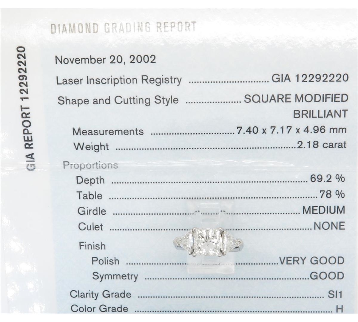 One tested platinum designer Martin Flyer diamond ring. Containing: One GIA Certified Princess Cut Diamond. Size: 2.18CT, Clarity: SI1, Color: H. Two Trilliant Cut Diamonds. Approximate total diamond weight: 3.27CTW. Diamonds are graded in the mounting, GIA Appraised.
