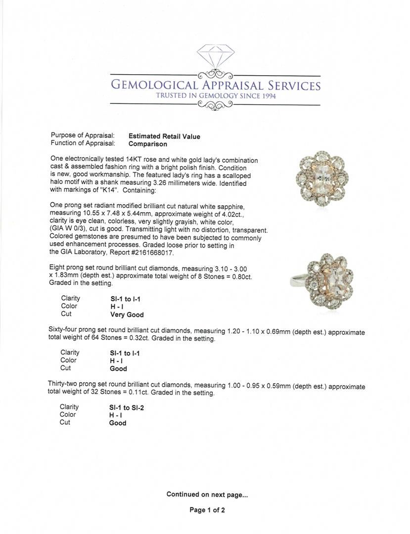 One electronically tested 14KT rose and white gold lady's combination cast & assembled fashion ring with a bright polish finish. The featured lady's ring has a scalloped halo motif with a shank measuring 3.26 millimeters wide. Identified with markings of "K14". Condition is new, good workmanship. Containing: One prong set radiant modified brilliant cut natural white sapphire, measuring 10.55 x 7.48 x 5.44mm, approximate weight of 4.02ct., clarity is eye clean, colorless, very slightly grayish, white color, (GIA W 0/3), cut is good. Transmitting light with no distortion, transparent. Colored gemstones are presumed to have been subjected to commonly used enhancement processes. Graded loose prior to setting in the GIA Laboratory, Report #2161668017.Eight prong set round brilliant cut diamonds, measuring 3.10 - 3.00 x 1.83mm (depth est.) approximate total weight of 8 Stones = 0.80ct. Graded in the setting. Clarity: SI-1 to I-1. Color: H - I. Cut Very Good Sixty-Four prong set round brilliant cut diamonds, measuring 1.20 - 1.10 x 0.69mm (depth est.) approximate total weight of 64 Stones = 0.32ct. Graded in the setting. Clarity: SI-1 to I-1. Color: H - I. Cut Good Thirty-Two prong set round brilliant cut diamonds, measuring 1.00 - 0.95 x 0.59mm (depth est.) approximate total weight of 32 Stones = 0.11ct. Graded in the setting. Clarity: SI-1 to SI-2. Color: H - I. Cut Good. Total Weight of Colored Stones 4.02ct. Total Weight of Diamonds 1.23ct. Total Weight of Ring 8.50gm. GAS Appraised at $17,155.00.