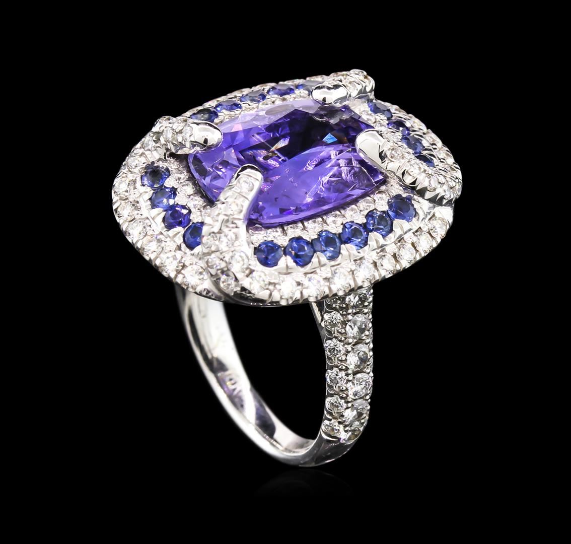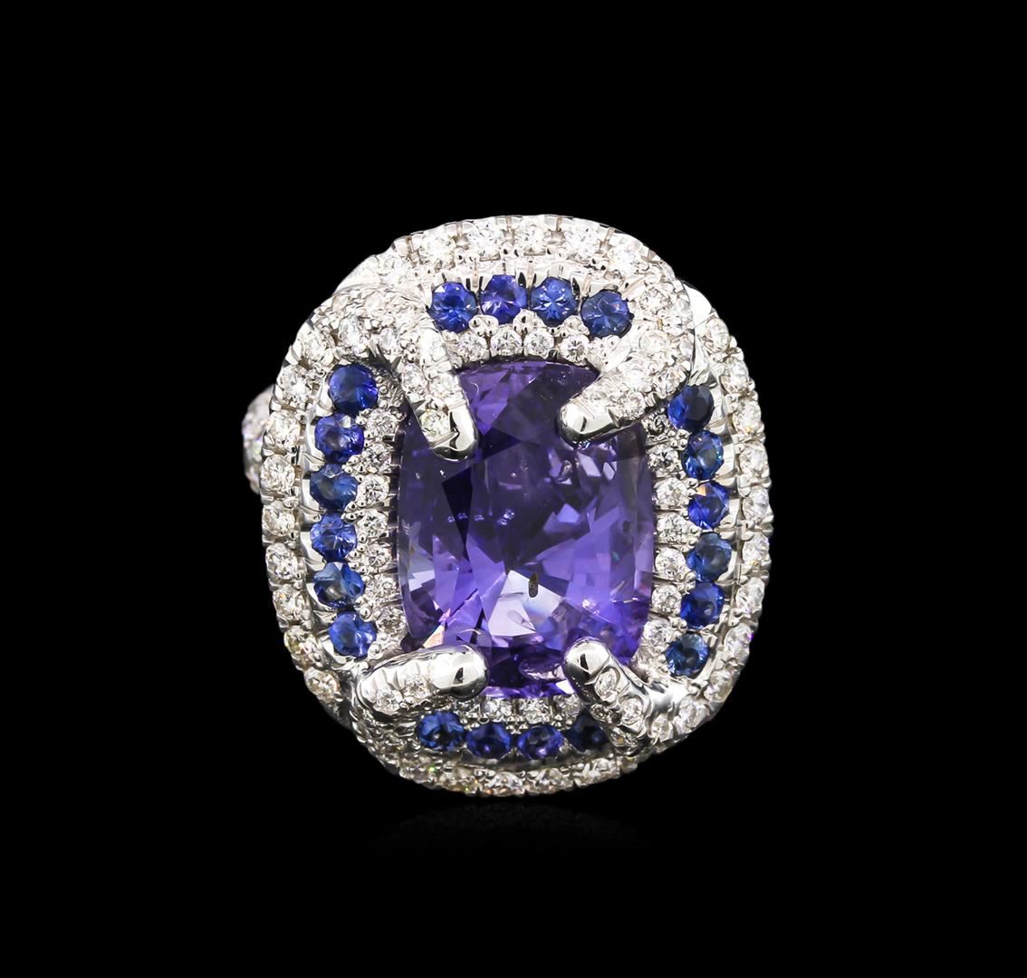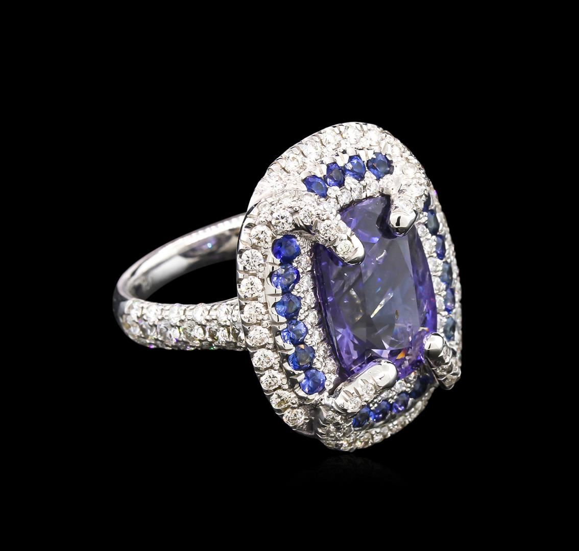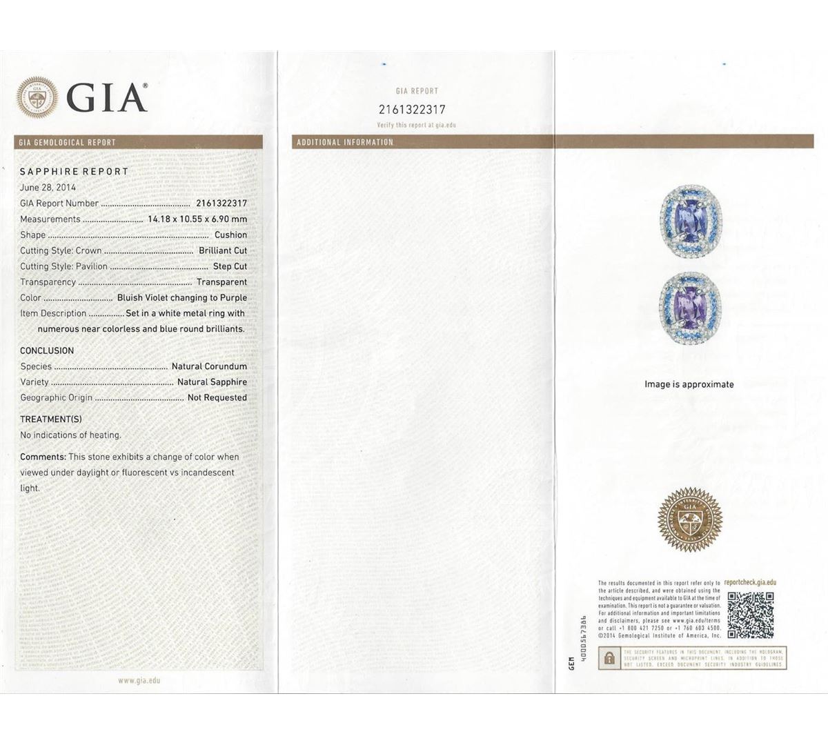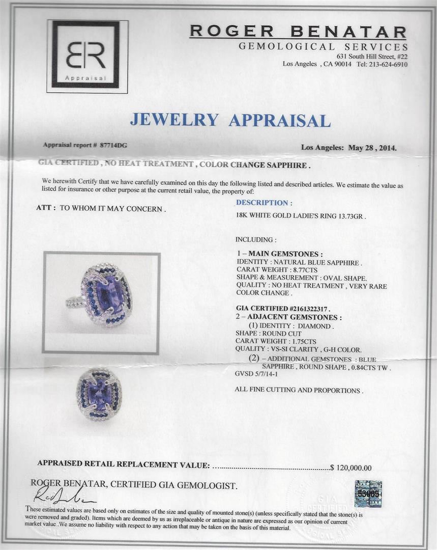 GIA certified, no heat treatment, color change sapphire. 18K white gold ladies ring 13.73 gr. Including: 1- MAIN GEMSTONES: Identity: Natural Blue Sapphire. Carat Weight: 8.77cts. Shape & Measurement: Oval Shape. Quality: No Heat Treatment, Very Rare Color Change. 2- ADJACENT GEMSTONES: (1) Identity: Diamond. Shape: Round Cut. Carat Weight: 1.75cts. Quality: VS-SI Clarity, G-H Color. (2) - Additional Gemstones: Blue Sapphire, Round Shape, 0.84cts tw. All Fine Cutting And Proportions. RBGS Appraised at $120,000.00.