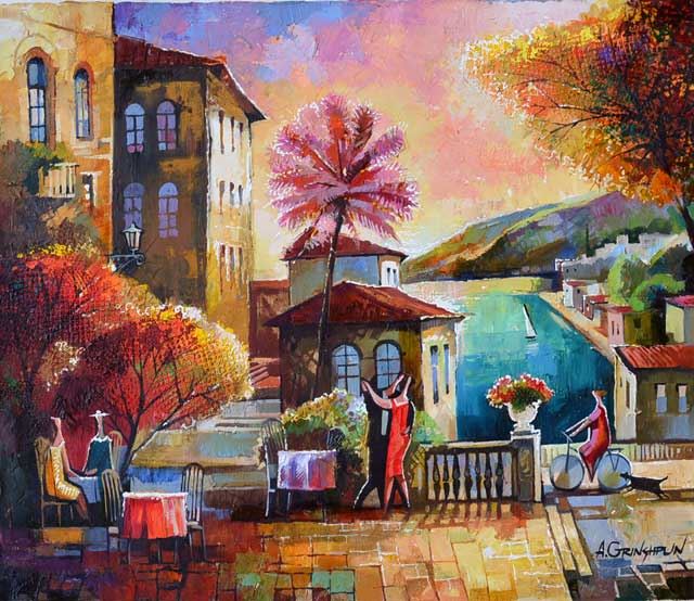 Artist: Alexander Grinshpun (b. 1949) - Title: Dance with Me - Medium: Original Acrylic on Canvas - Signature: This one-of-a-kind work is hand-signed by the artist at the bottom of the image - Image Size: Approximately 20 inches x 24 inches - Unframed on Unstretched Canvas - Details:This work comes with a Certificate of Authenticity - Biography: Born in Moldova in April 1949, Grinshpun graduated from art school in 1968. He specialized in creating background scenery for theater and opera at the St. Petersburg Art Academy. He also participated in many exhibitions across the former U.S.S.R., in cities such as Kishiniev, Odessa and Tiraspol. - Alexander has displayed in several local exhibitions in the Beit Shean Valley, as well as participating in group exhibitions at Chagall House in Haifa in 1994, 1995 and 1997. In 2003 he had a solo exhibition in the Center for Arts in Rishon Le Zion. Approximately 80 pieces were exhibited in two show rooms. Since November 2003, Alexander is exhibiting his works in a gallery in Raanana. In 2004 a few of his works were displayed in a NY exhibition. New York International "Art Expo" 2004-2007 his works were displayed in Art 107 gallery in Tel-Aviv, among other galleries in Israel. -