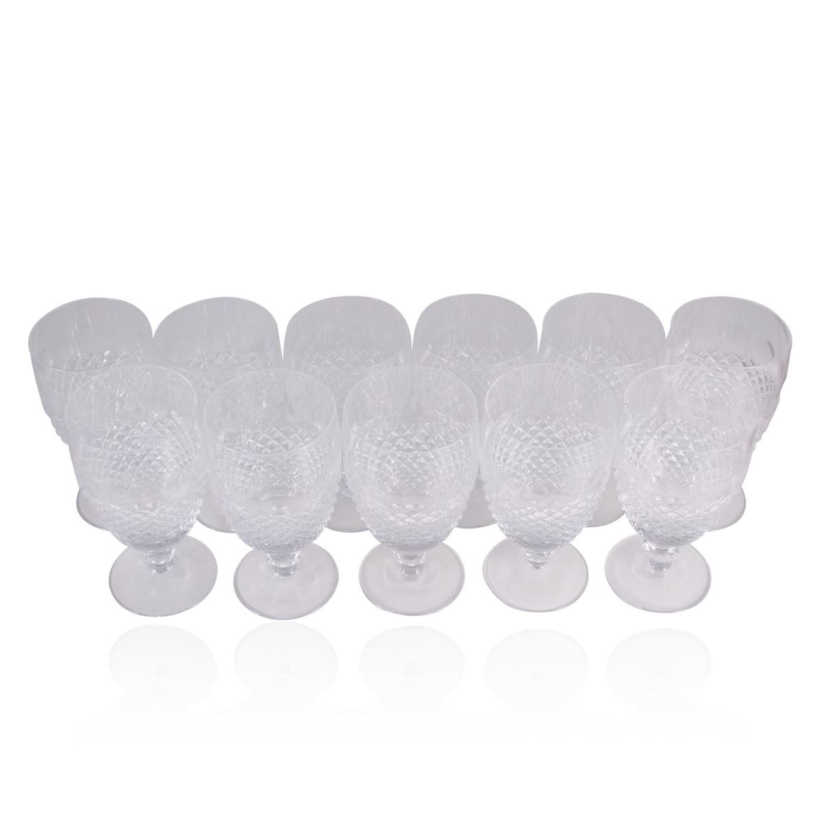 11 beautiful crystal water goblets with smooth foot. Each goblet is 5 3/4" h x 2 3/4" diameter. All are in great condition.