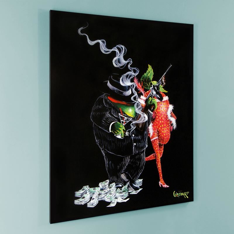 With unforgettable characters and undeniable charm, Michael Godard creates artworks that are sure to be the centerpiece of any room! "Gangster Love" is a limited edition giclee on stretched canvas, CS numbered and bears Godard's authorized signature! This piece comes gallery wrapped. Includes Certificate of Authenticity! Measures approx. 28" x 35" (image).