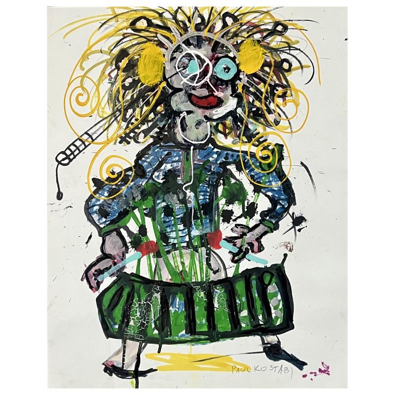 "Garden of Earthly Delight" is an original painting, mixed media on paper by Paul Kostabi. The piece comes hand signed by the artist and with a letter of authenticity. Measures approximately 24" x 19".