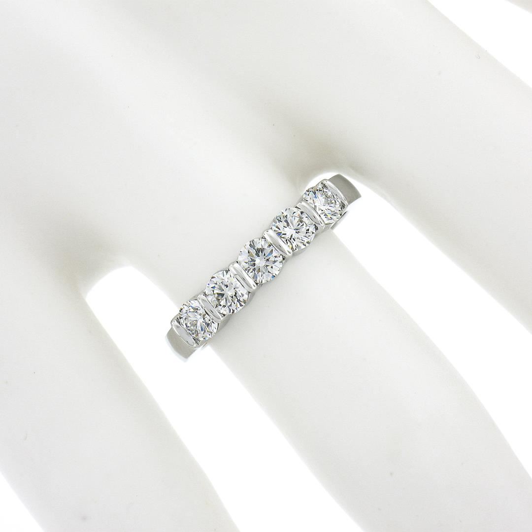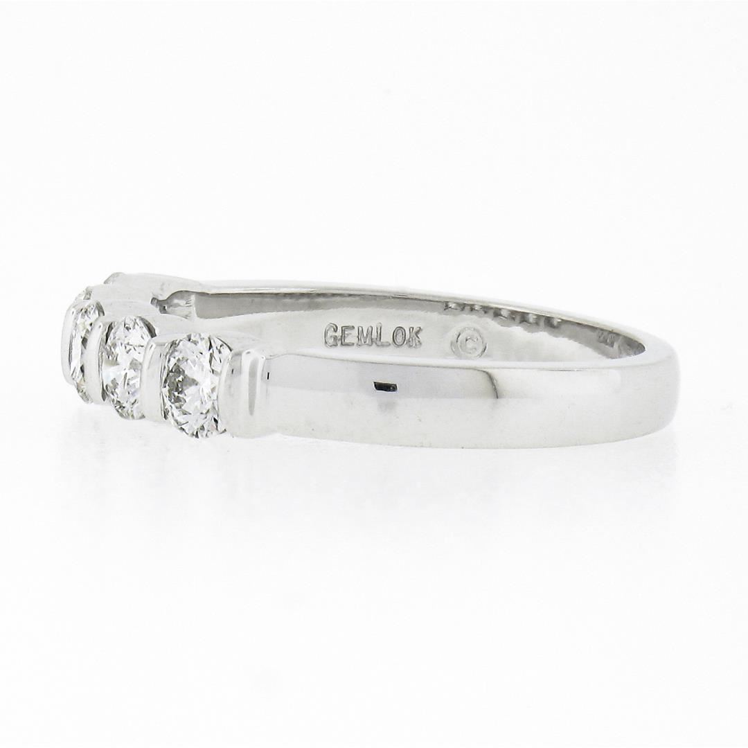 A solid 18k white gold band ring by Gemlok, featuring 5 round ideal cut natural diamonds (F/G - VS1/VS2 ; 0.76ctw). The ring is size 5.5, weighs a total of 3.62 grams, and measures 3.60mm wide.