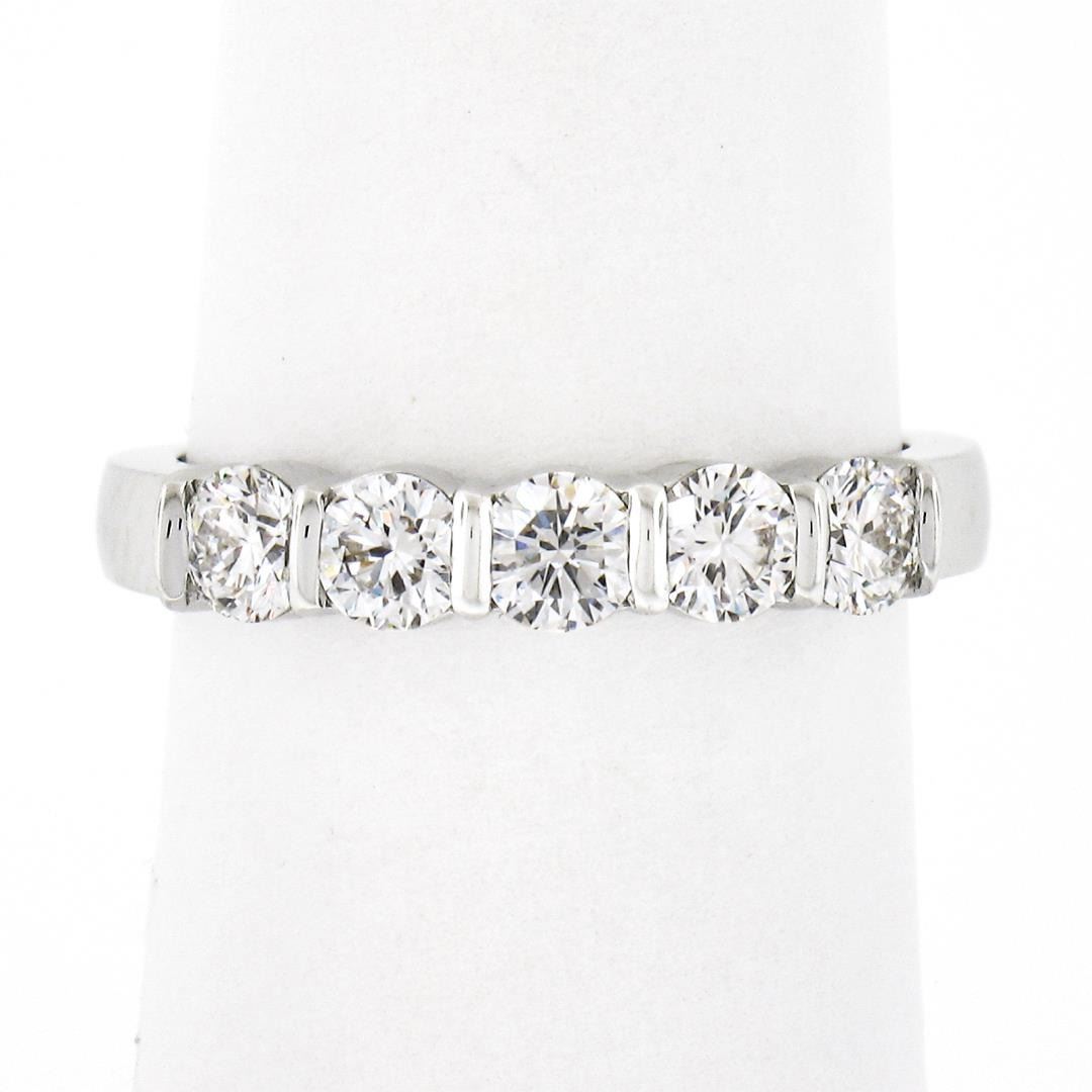 A solid 18k white gold band ring by Gemlok, featuring 5 round ideal cut natural diamonds (F/G - VS1/VS2 ; 0.76ctw). The ring is size 5.5, weighs a total of 3.62 grams, and measures 3.60mm wide.