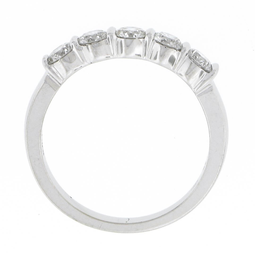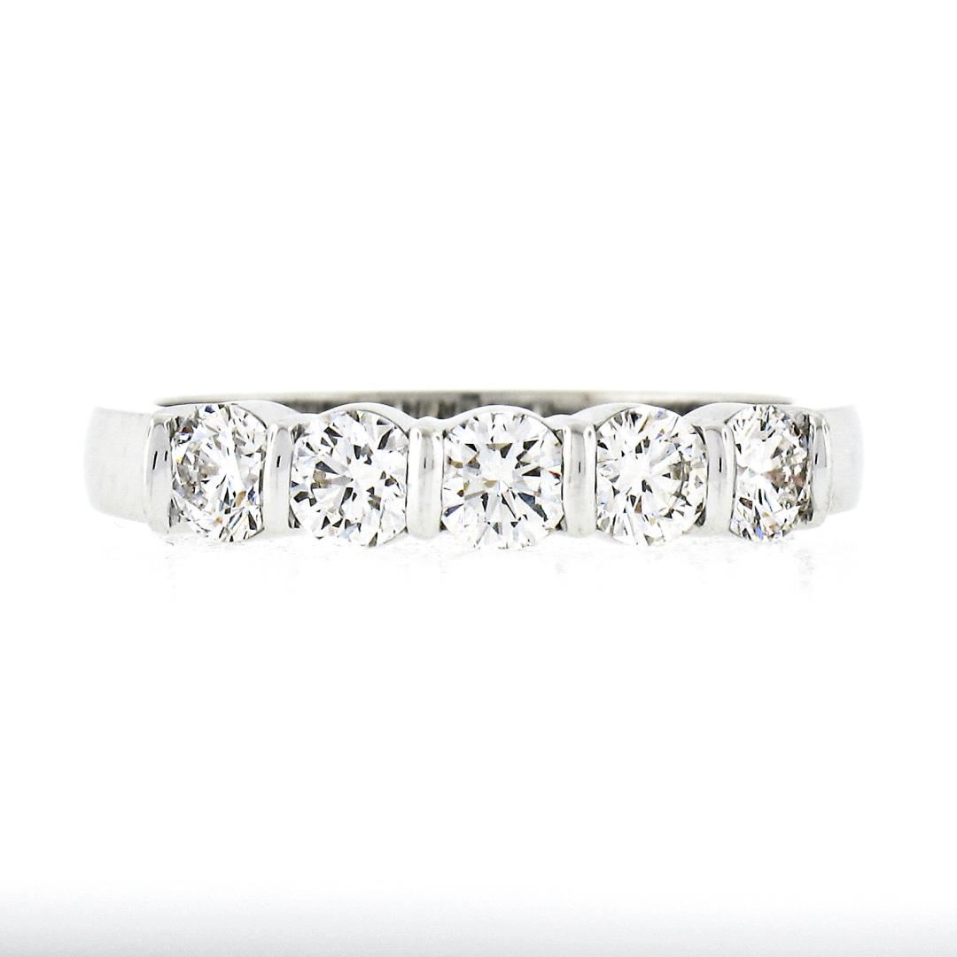 A solid 18k white gold band ring by Gemlok, featuring 5 round ideal cut natural diamonds (F/G - VS1/VS2 ; 0.76ctw). The ring is size 5.5, weighs a total of 3.62 grams, and measures 3.60mm wide.