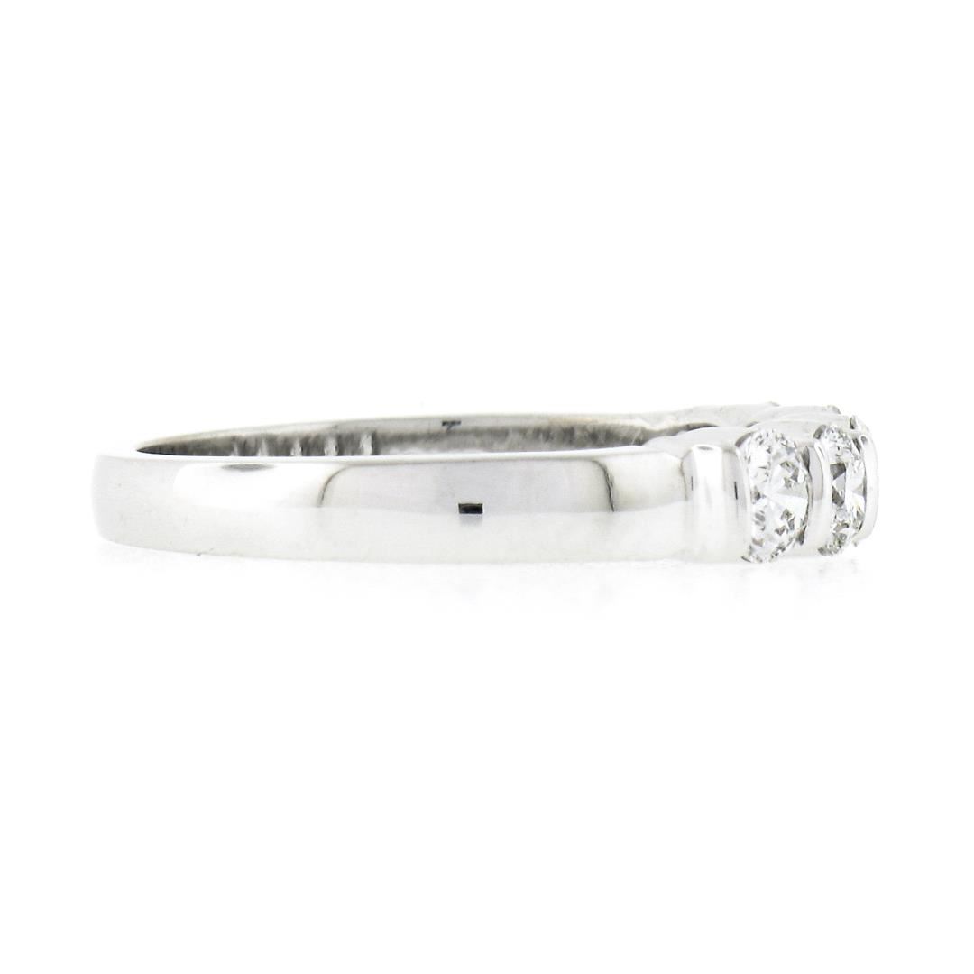 A solid 18k white gold band ring by Gemlok, featuring 5 round ideal cut natural diamonds (F/G - VS1/VS2 ; 0.76ctw). The ring is size 5.5, weighs a total of 3.62 grams, and measures 3.60mm wide.
