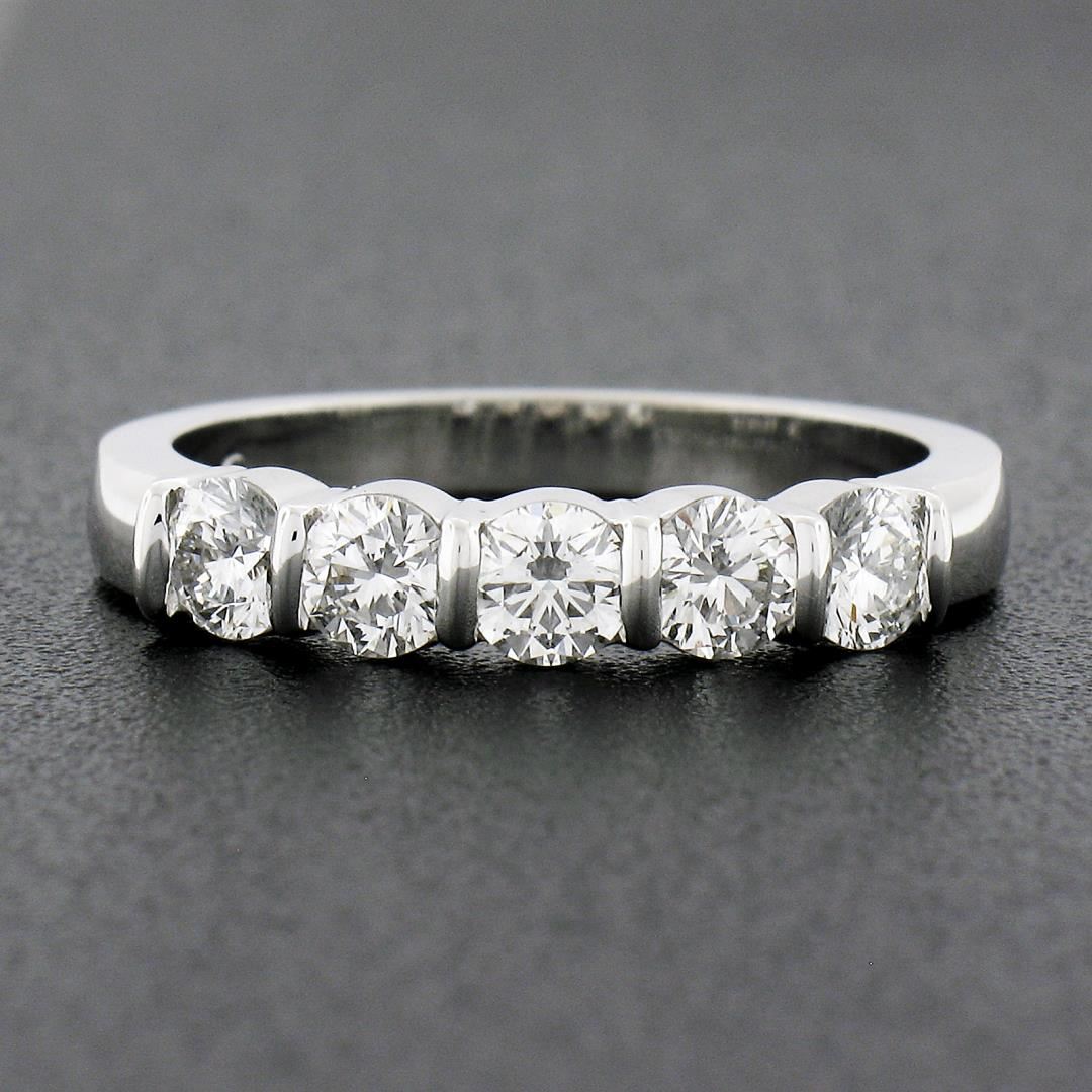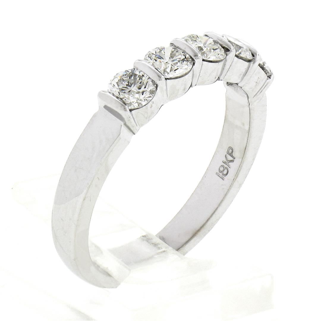 A solid 18k white gold band ring by Gemlok, featuring 5 round ideal cut natural diamonds (F/G - VS1/VS2 ; 0.76ctw). The ring is size 5.5, weighs a total of 3.62 grams, and measures 3.60mm wide.