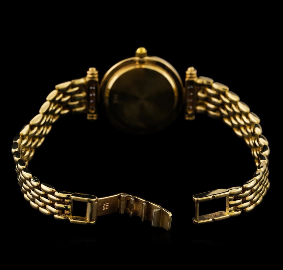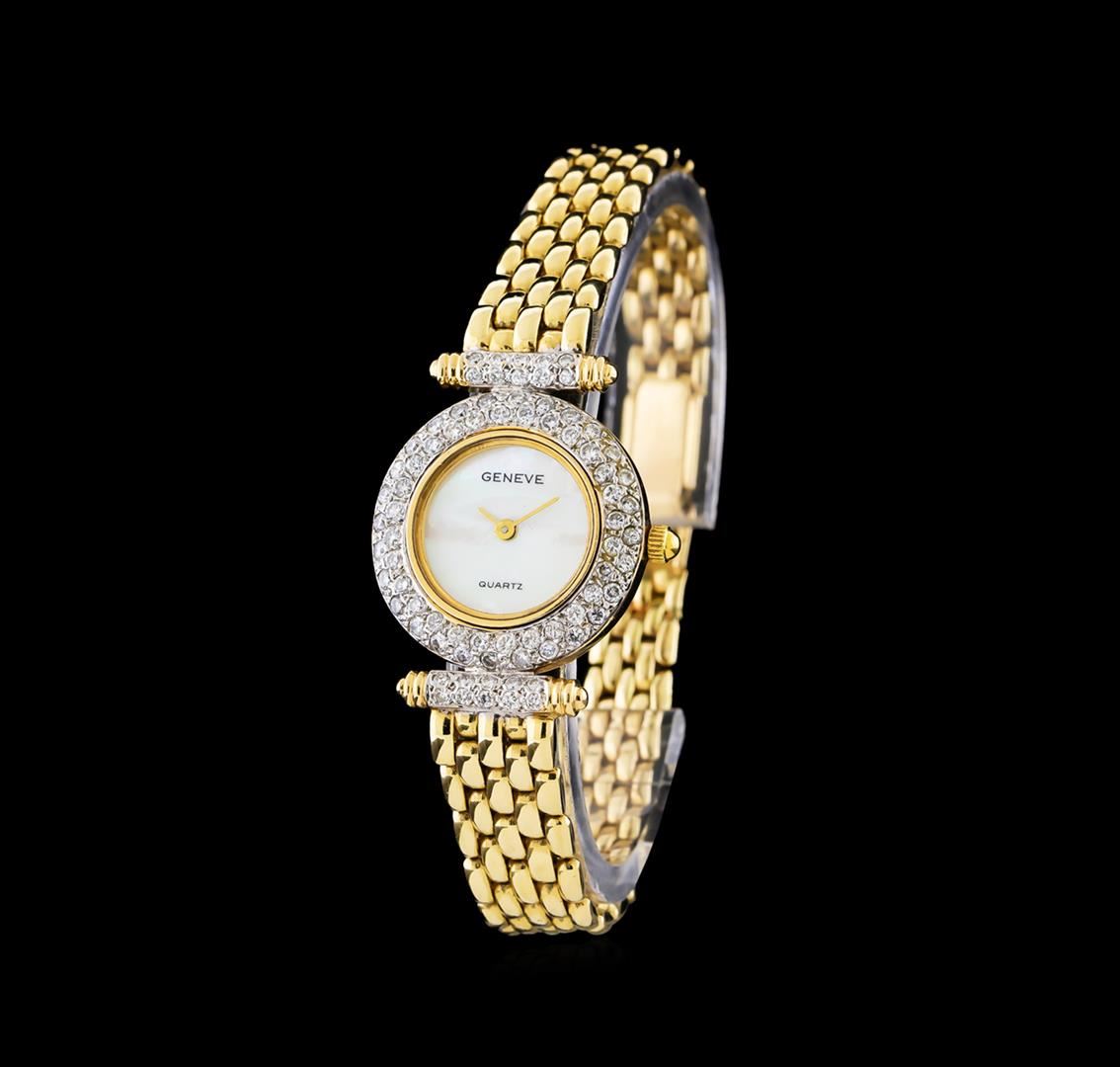 One ladies, cast & assembled Geneve wristwatch electronically tested 14KT yellow gold, Case: 22mm diameter, Case Back: space available for engraving, Fixed Case Lugs: set with diamonds, Crown: scalloped, Bezel: diamond set. Swiss Movement: six jewel quartz, Geneve signed Dial: mother of pearl with baton pointed hands, Bracelet: 14KT yellow gold links, Condition: G-6 Extra Fine. Six and one half inch length. Over-locking clasp, with pattern continuation. Containing: Fifty-Six prong set round brilliant cut diamonds, measuring 1.60 - 1.60 x 0.96mm (depth est.) approximate total weight of 56 Stones = 0.88ct. Graded in the setting. Clarity: SI-1 to I-1. Color: G - H Twenty prong set round brilliant cut diamonds, measuring 1.40 - 1.40 x 0.84mm (depth est.) approximate total weight of 20 Stones = 0.22ct. Graded in the setting. Clarity: SI-1 to I-1. Color: G - H. Total Weight of Diamonds 1.10ct. Total Weight of Watch 34.39gm. AIG Appraised at $6,050.00.