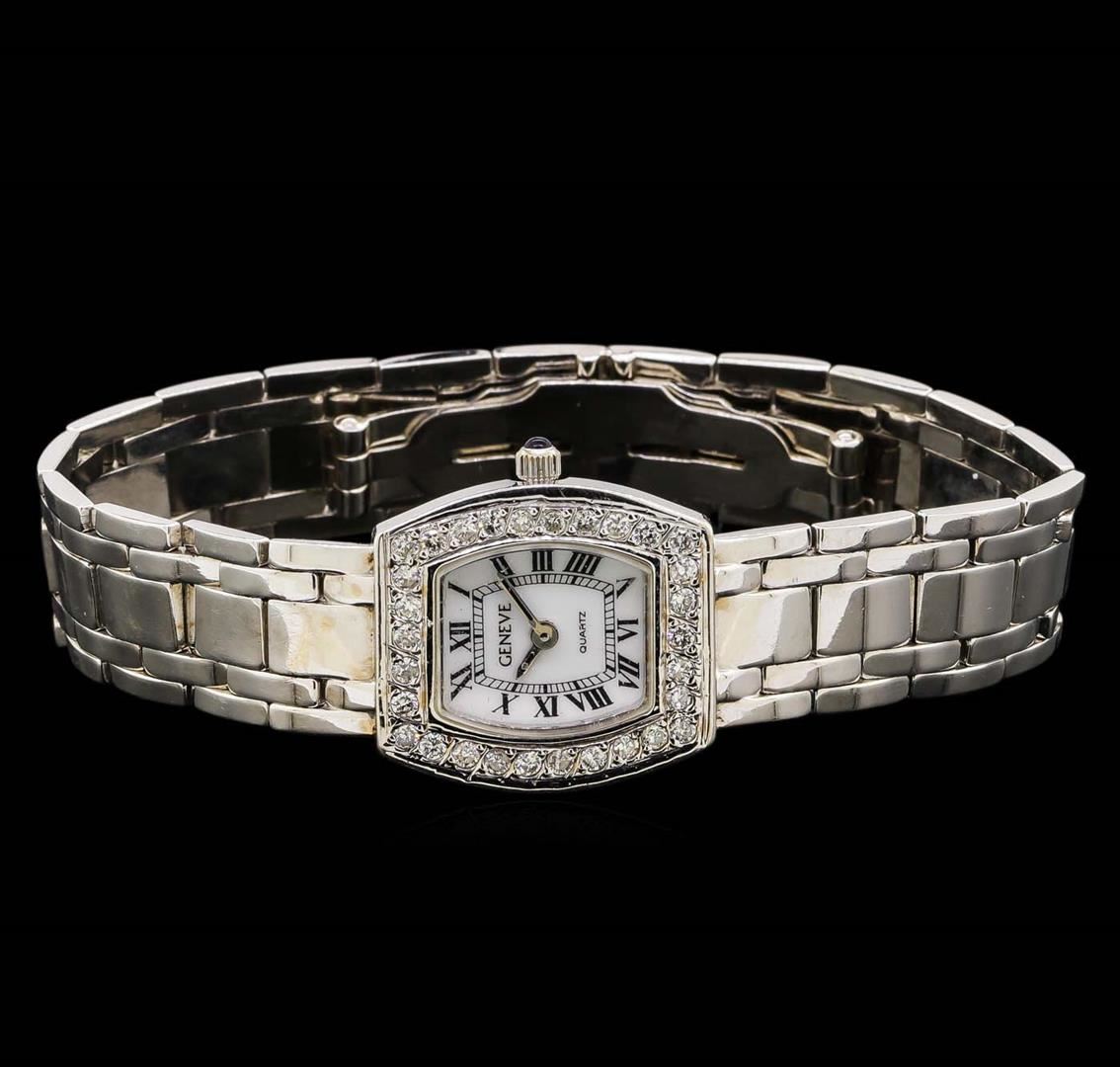 One ladies, cast & assembled Genève wristwatch electronically tested 14KT white gold, Case: 23 x 21mm, Crown: scalloped, set with a Blue cabochon crystal, Bezel: diamond set. Movement: quartz, Dial: White, baton pointed hands and Roman numerals, Bracelet: 14KT white gold links, Condition: G-4 Average. Six and one half inch length. Concealed deployment clasp. Containing: Thirty bead set round brilliant cut diamonds, measuring 2.00 - 1.90mm in diameter, approximate. Total Weight of 30 Stones = 0.92ct. Graded in the setting. Clarity: SI-2 to I-2. Color: G - H. Total Weight of Diamonds 0.92ct. Total Weight of Watch 52.71 grams. AIG Appraised at $6,050.00.