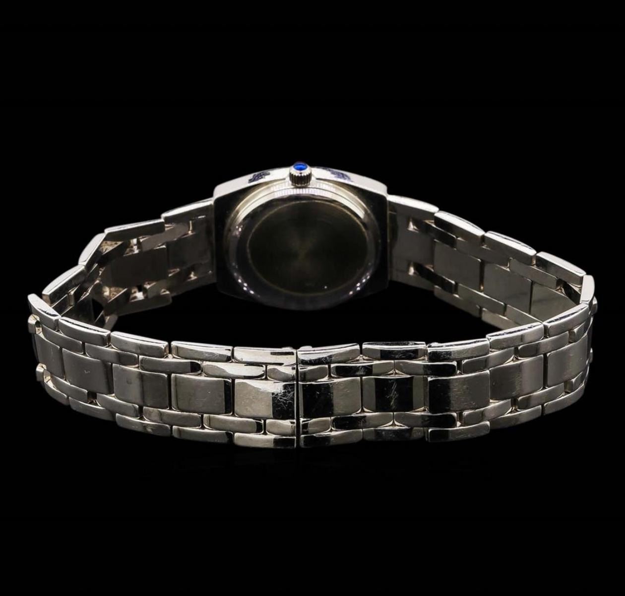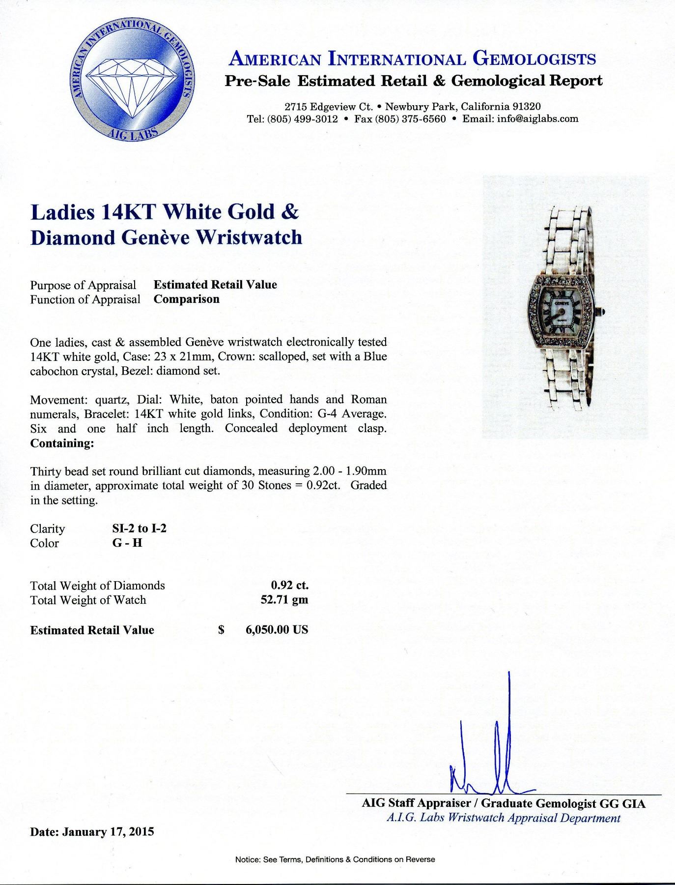 One ladies, cast & assembled Genève wristwatch electronically tested 14KT white gold, Case: 23 x 21mm, Crown: scalloped, set with a Blue cabochon crystal, Bezel: diamond set. Movement: quartz, Dial: White, baton pointed hands and Roman numerals, Bracelet: 14KT white gold links, Condition: G-4 Average. Six and one half inch length. Concealed deployment clasp. Containing: Thirty bead set round brilliant cut diamonds, measuring 2.00 - 1.90mm in diameter, approximate. Total Weight of 30 Stones = 0.92ct. Graded in the setting. Clarity: SI-2 to I-2. Color: G - H. Total Weight of Diamonds 0.92ct. Total Weight of Watch 52.71 grams. AIG Appraised.