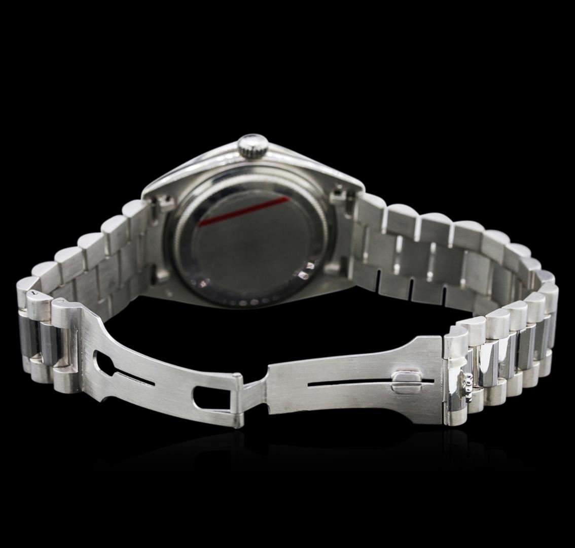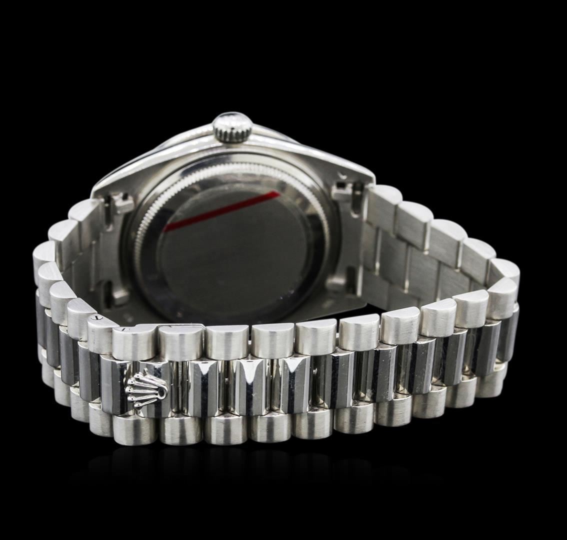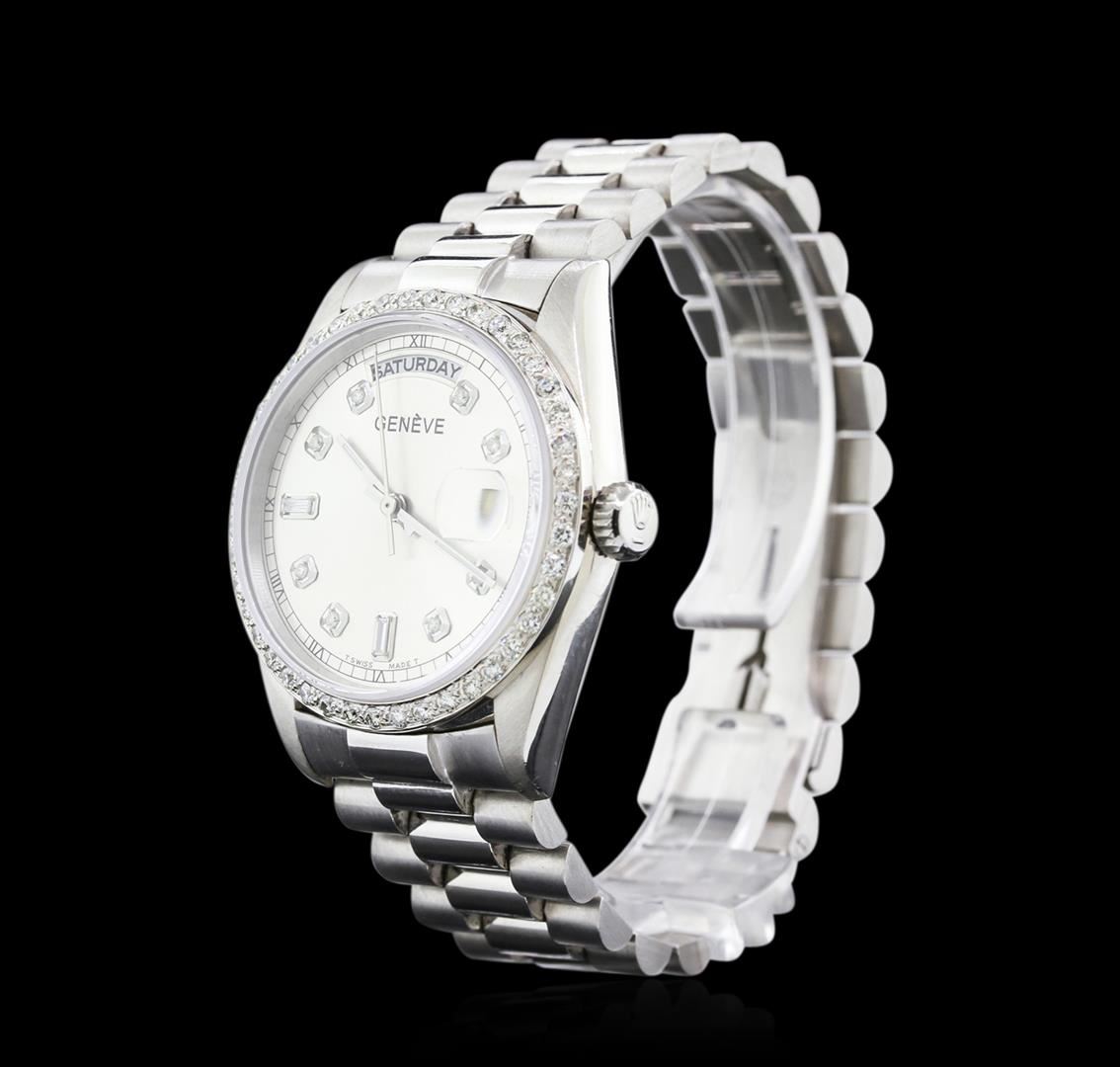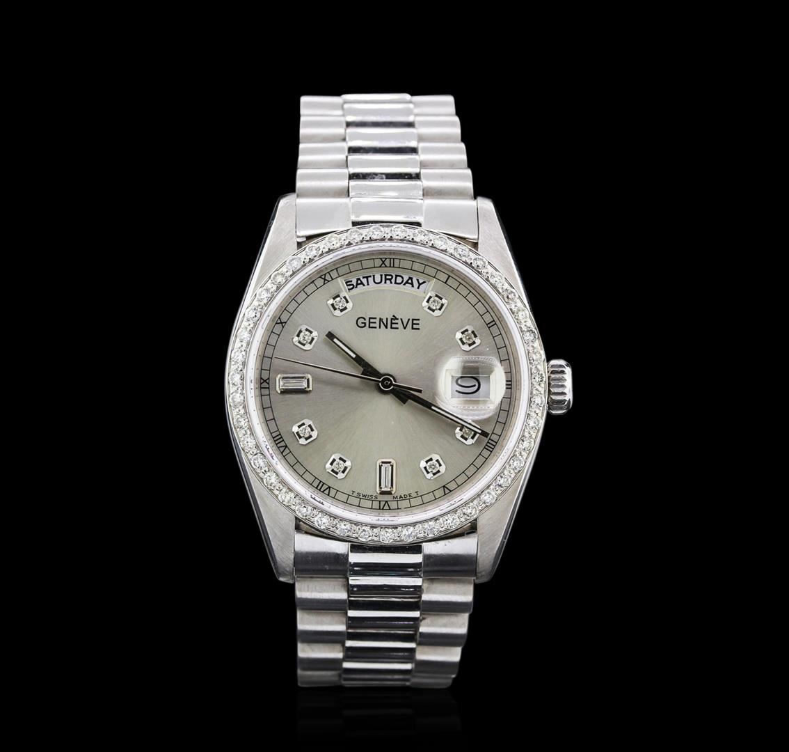 One Geneve 18KT White Gold Mens Day Date Rolex Replica Watch. Crown: 18KT white gold quickset with Rolex logo. Bezel: 18KT white gold set with diamonds. Dial: Gray color with diamond markers and GENEVE logo at the top middle portion of the dial. Day and date window located at the 12 and 3 o'clock positions respectively. Bracelet: 18KT white gold. Please note that this watch contains Rolex parts but is not an authentic Rolex.