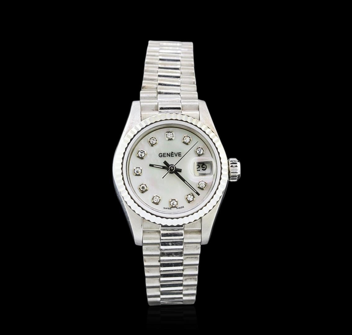 One Geneve Stainless Steel Ladies DateJust Rolex Replica Watch. Case: Stainless steel. Crown: Stainless steel quickset with Rolex logo. Bezel: Stainless steel. Dial: Mother of pearl color with diamond markers and GENEVE logo at the top middle portion of the dial. Date window located at the 3 o'clock position. Bracelet: Stainless steel. Case back has minor surface scratches. Please note that this watch contains Rolex parts but is not an authentic Rolex.