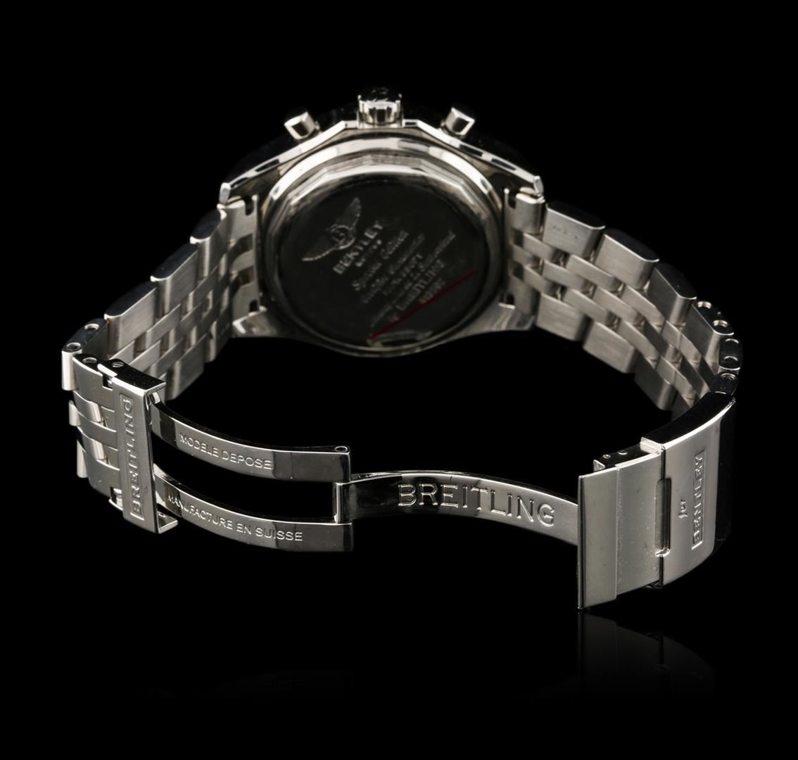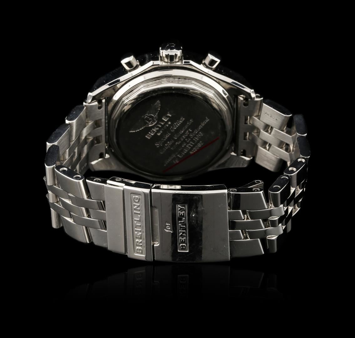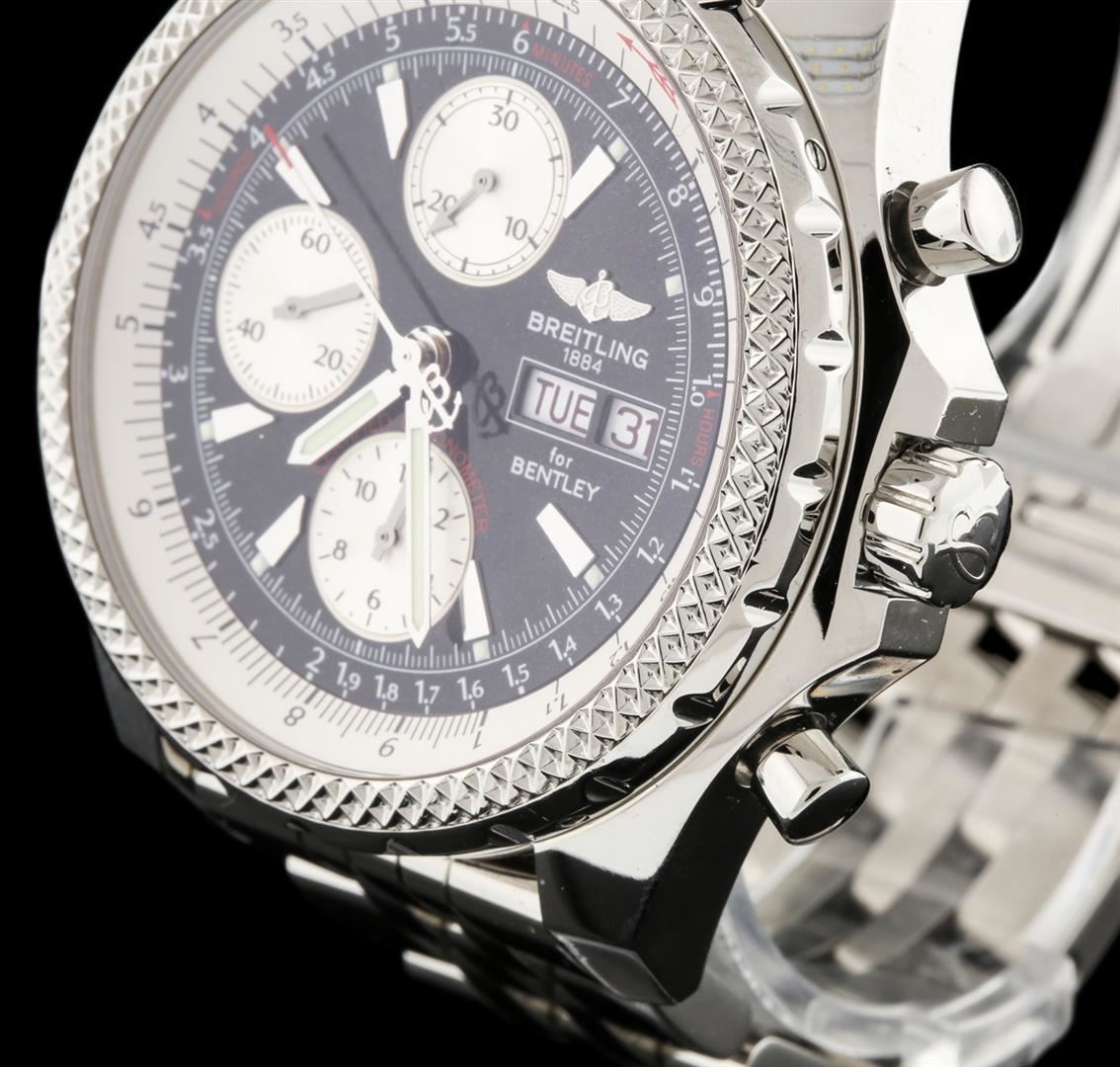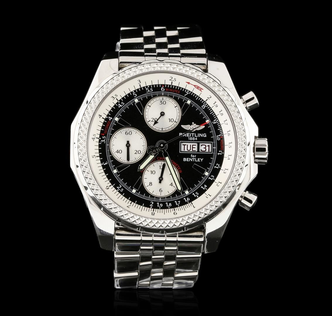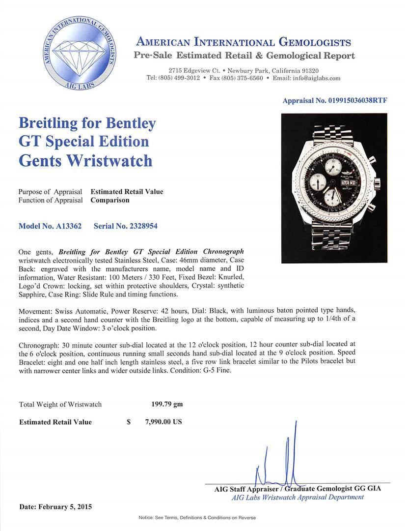 One gents, Breitling for Bentley GT Special Edition Chronograph wristwatch electronically tested Stainless Steel, Case: 46mm diameter, Case Back: engraved with the manufacturers name, model name and ID information, Water Resistant: 100 Meters / 330 Feet, Fixed Bezel: Knurled, Logo'd Crown: locking, set within protective shoulders, Crystal: synthetic Sapphire, Case Ring: Slide Rule and timing functions. Movement: Swiss Automatic, Power Reserve: 42 hours, Dial: Black, with luminous baton pointed type hands, indices and a second hand counter with the Breitling logo at the bottom, capable of measuring up to 1/4th of a second, Day Date Window: 3 o'clock position. Chronograph: 30 minute counter sub-dial located at the 12 o'clock position, 12 hour counter sub-dial located at the 6 o'clock position, continuous running small seconds hand sub-dial located at the 9 o'clock position. Speed Bracelet: eight and one half inch length stainless steel, a five row link bracelet similar to the Pilots bracelet but with narrower center links and wider outside links. Condition: G-5 Fine. Total Weight of Wristwatch 199.79 grams. AIG Appraised at $7,990.00.