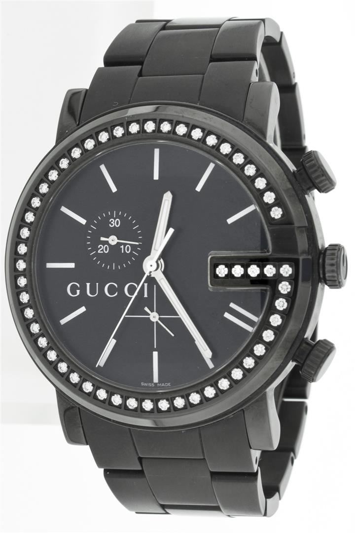 One Gents Gucci 101M Chrono, Serviced & Electronically Tested, Black PVD Case:41mm, Black PVD Crown, Custom Bezel: Black PVD Diamond Bezel, Diamond Count: 52 Diamonds Total Weight 2.00 Carat, Clarity: SI-VS, Color: G to H. Custom Crystal: Sapphire Lens. Movement: Quartz. Dial: Black G Dial with Sub Second Dial. Condition: G-6 Extra Fine. Bracelet: Black PVD. 7.0 Inch Length, Adjustable. Standard Clasp. Comes With Box and Papers.