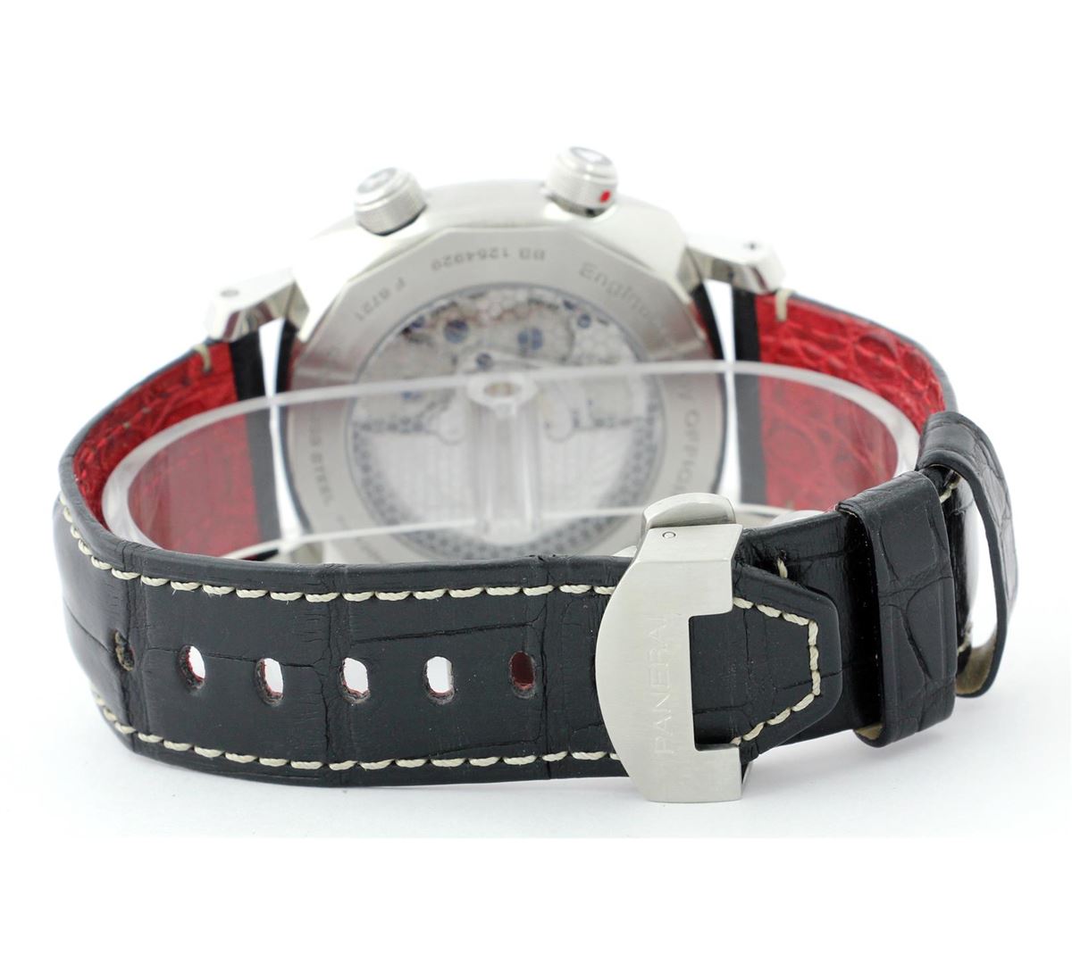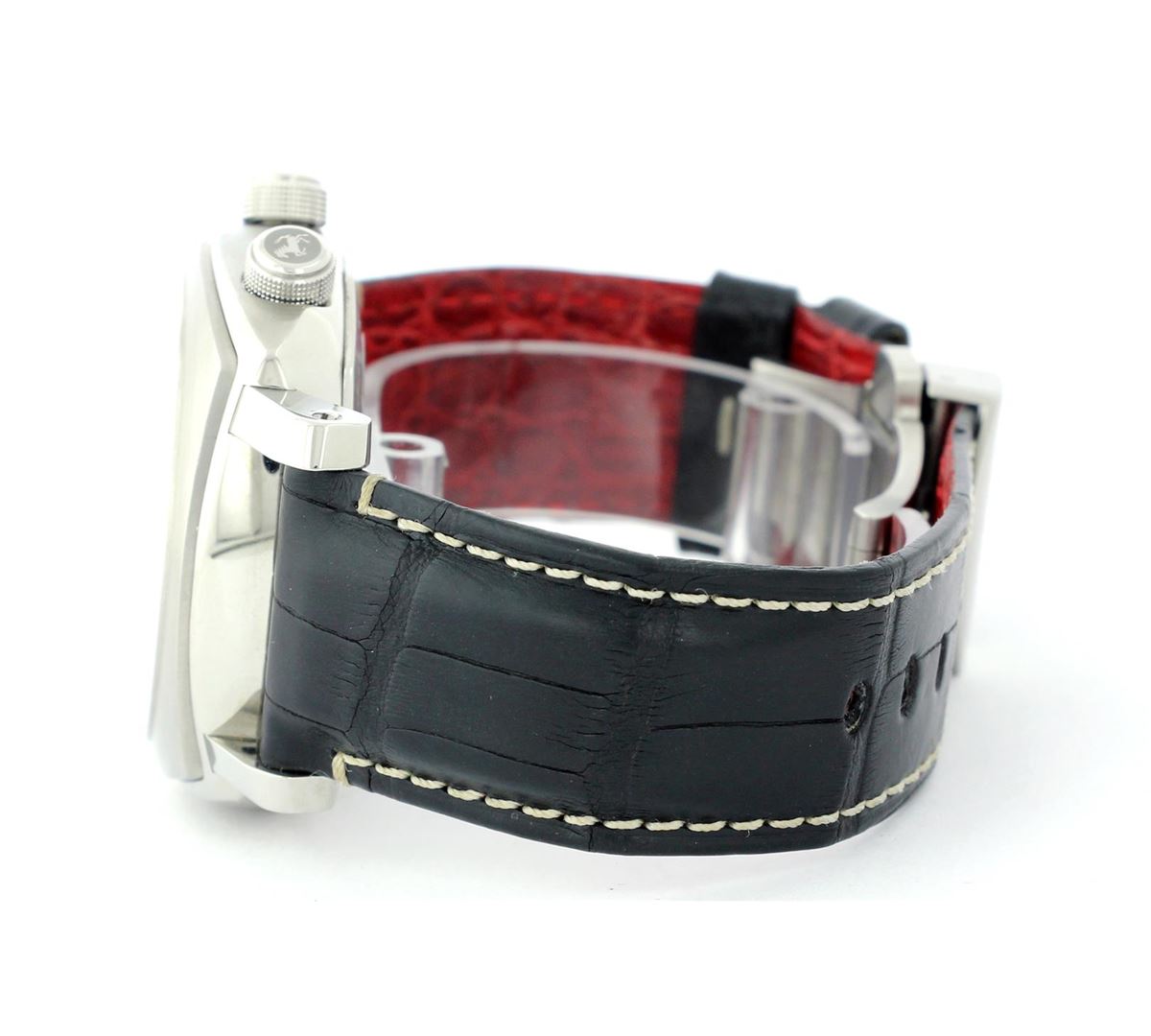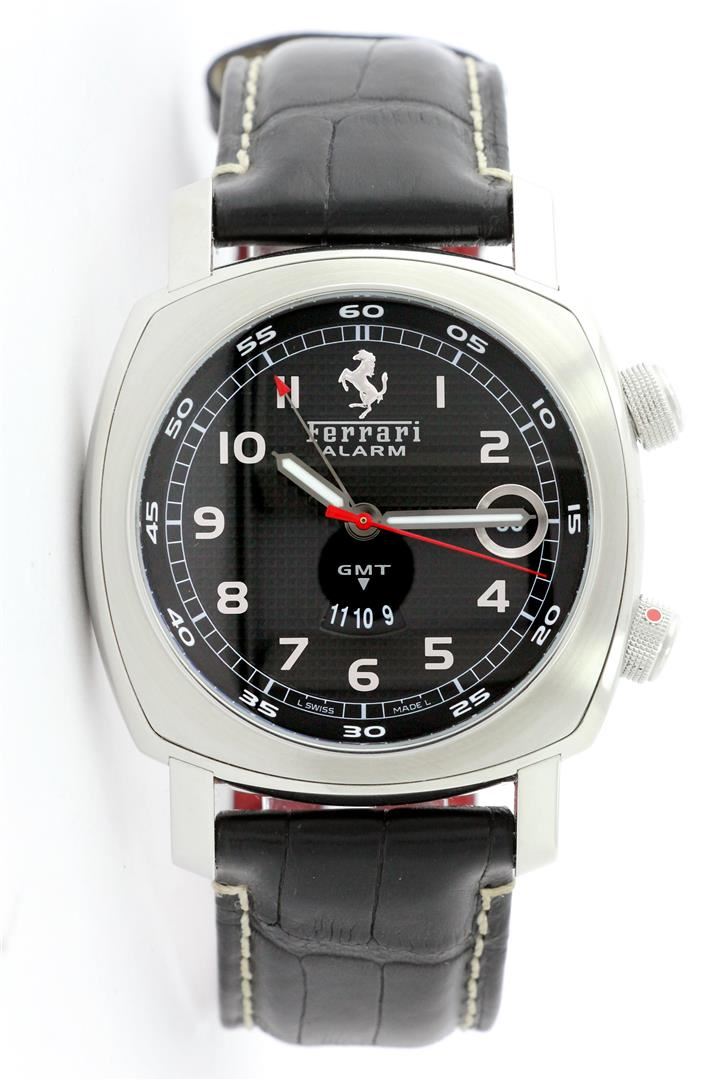 One Gents Stainless Steel Panerai Ferrari Alarm, Serviced & Electronically Tested, Case:45mm, Stainless Steel Crown, Bezel: Stainless Steel Bezel, Crystal: Sapphire Lens. Movement: Automatic Winding Movement. Dial: Black Dial With Arabic Hour Markers, Date window at 3 O'Clock position. Model# 6721 Condition: G-8 Mint. Band: Black Leather 7.5 Inch Length, Adjustable. Standard Clasp, With Panerai Clasp Mark, Comes with Box and Papers and Extra Band.