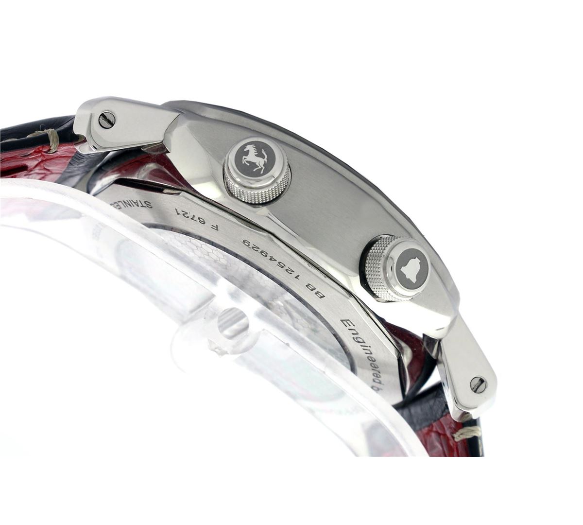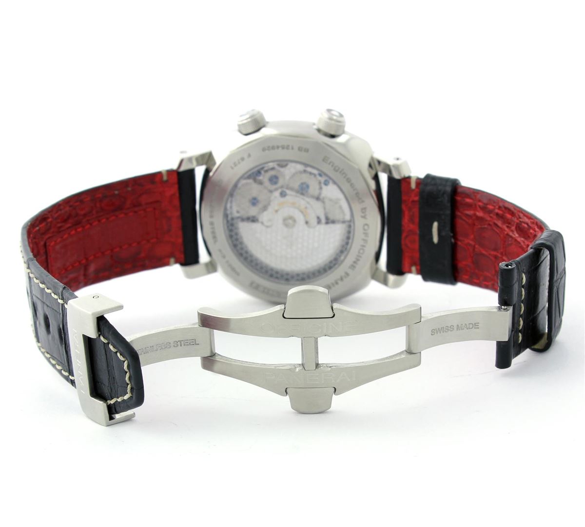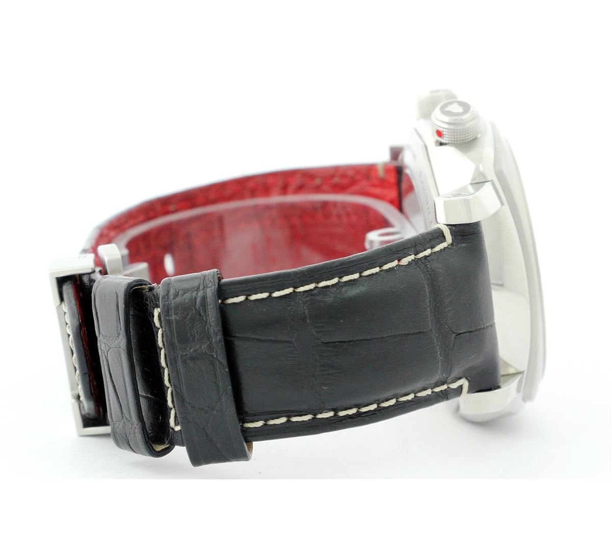 One Gents Stainless Steel Panerai Ferrari Alarm, Serviced & Electronically Tested, Case:45mm, Stainless Steel Crown, Bezel: Stainless Steel Bezel, Crystal: Sapphire Lens. Movement: Automatic Winding Movement. Dial: Black Dial With Arabic Hour Markers, Date window at 3 O'Clock position. Model# 6721 Condition: G-8 Mint. Band: Black Leather 7.5 Inch Length, Adjustable. Standard Clasp, With Panerai Clasp Mark, Comes with Box and Papers and Extra Band.