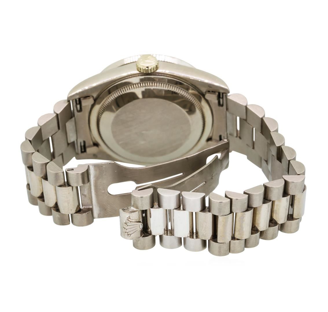 One gents, Rolex DayDate Model the President Wristwatch electronically tested 18KT White gold, Swiss Hallmarked Case: 36mm oyster, Rolex Signature Crown: twin lock with high relief Rolex logo, Custom Bezel: diamond set, Crystal: synthetic sapphire cyclops lens. Circa: 1995.Movement: superlative chronometer, Rolex signed Dial: Silver color, with baton hands, & diamond markers, Calendar: double-quick set, President Bracelet: 18KT White gold, bright polish and satin finish, Condition: G-6 Extra Fine. Seven inch length. Swiss & Rolex Hallmarked concealed deployment clasp, with logo Containing: Forty-Six prong set round brilliant cut diamonds, measuring 1.70 - 1.70 x 1.02mm (depth est.) approximate total weight of 46 Stones = 0.84ct. Set & graded in the bezel. Clarity: VVS-1 to VVS-2 Color F - G Ten prong set single cut & baguette cut diamonds, approximate total weight of 10 Stones = 0.16ct. Set & graded on the dial. Clarity: VVS-1 to VVS-2 Color F - H. Total Weight of Diamonds 1.00ct. Total Weight of Watch 138.85gm. AIG Appraised at $23,000.00.