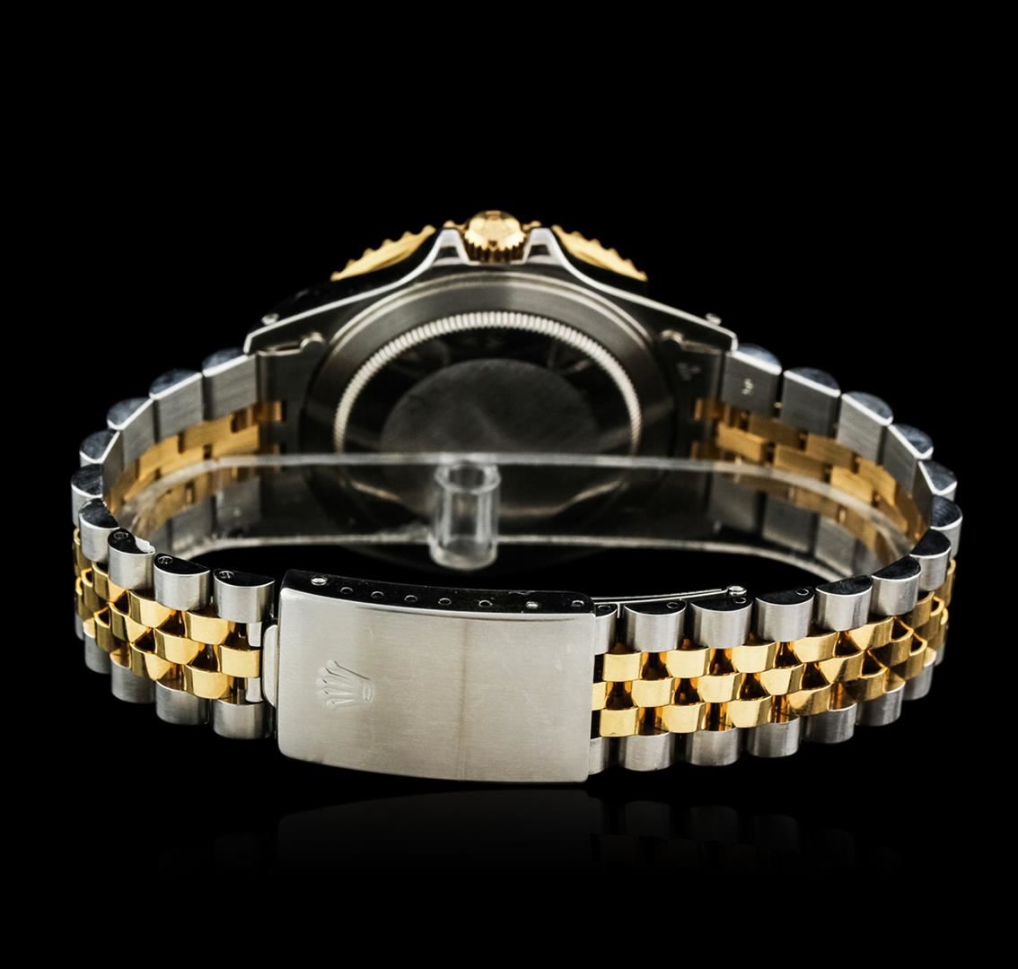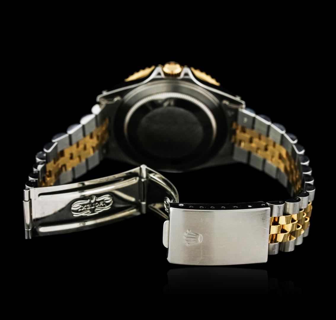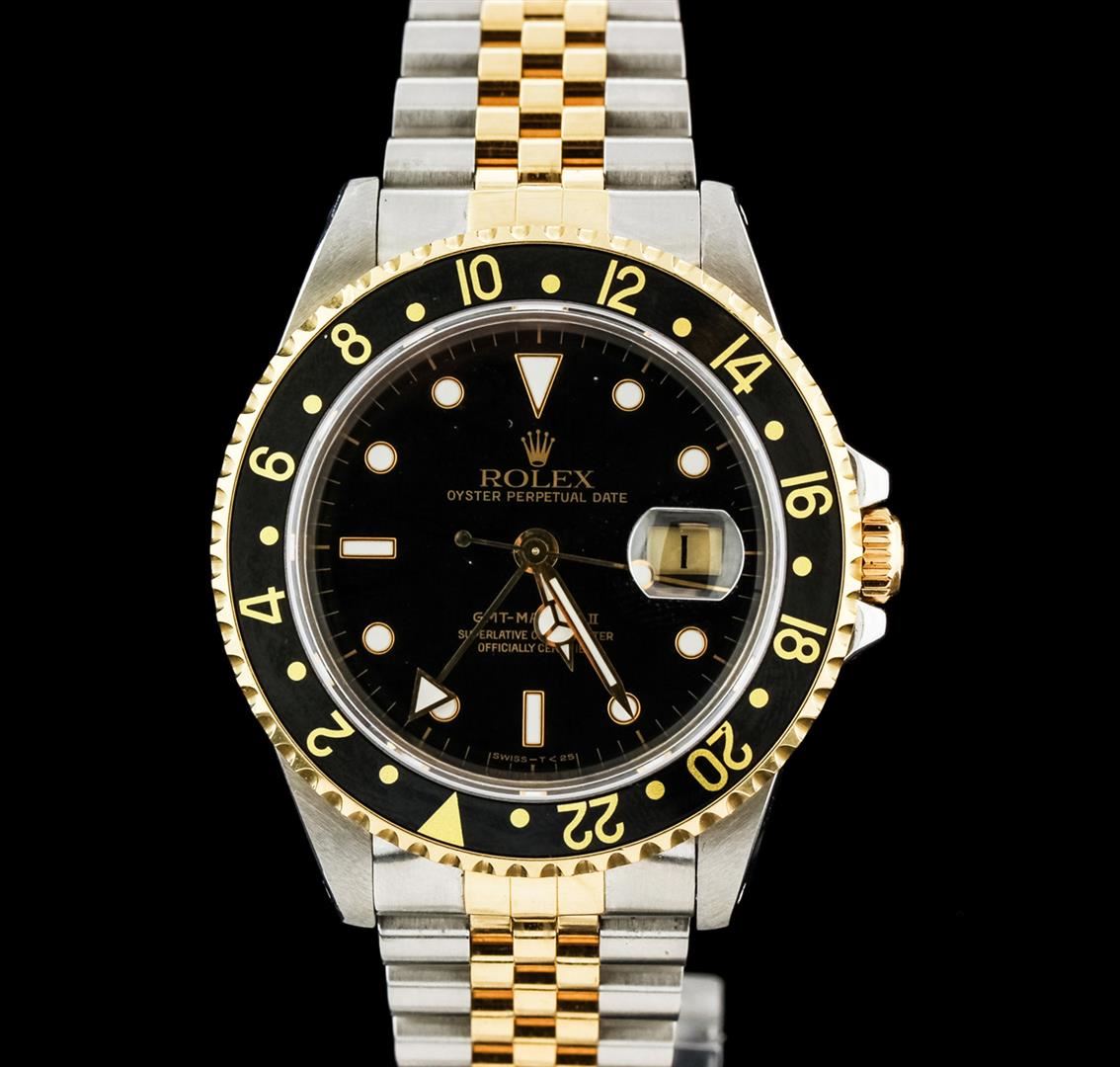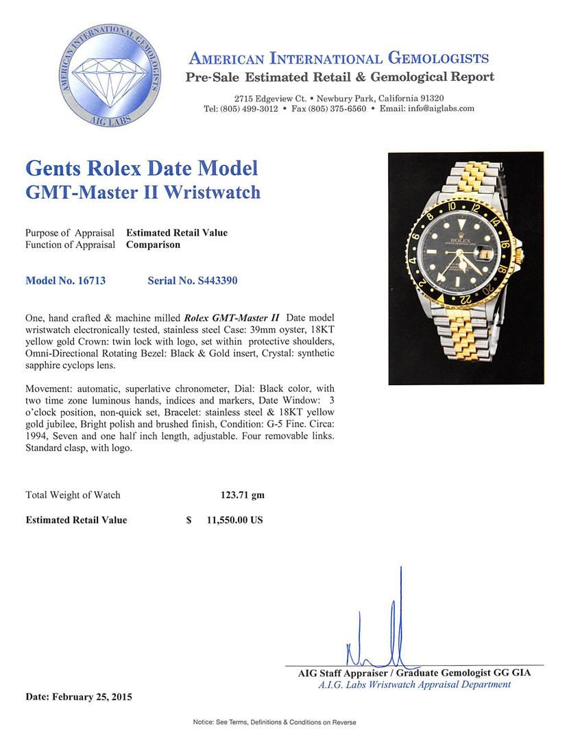 One, hand crafted & machine milled Rolex GMT-Master II Date model wristwatch electronically tested, stainless steel Case: 39mm oyster, 18KT yellow gold Crown: twin lock with logo, set within protective shoulders, Omni-Directional Rotating Bezel: Black & Gold insert, Crystal: synthetic sapphire cyclops lens. Movement: automatic, superlative chronometer, Dial: Black color, with two time zone luminous hands, indices and markers, Date Window: 3 o'clock position, non-quick set, Bracelet: stainless steel & 18KT yellow gold jubilee, Bright polish and brushed finish, Condition: G-5 Fine. Circa: 1994, Seven and one half inch length, adjustable. Four removable links. Standard clasp, with logo. Total Weight of Watch 123.71 grams. AIG Appraised at $11,550.00.