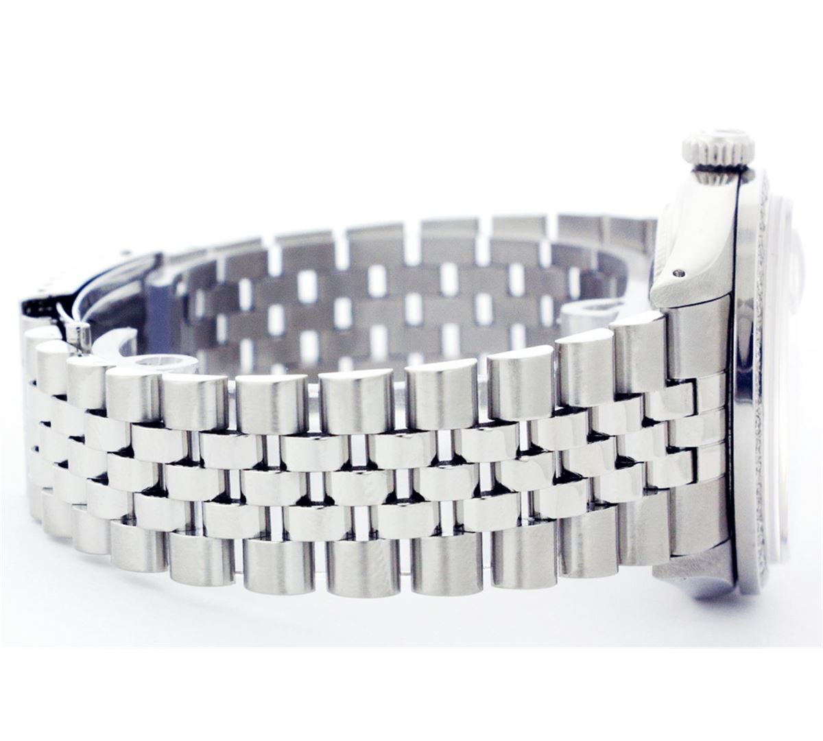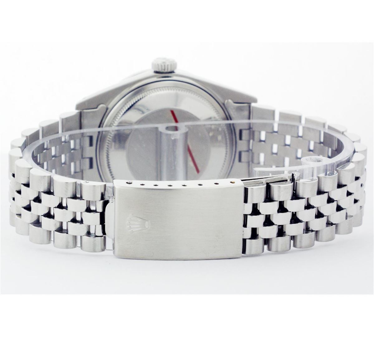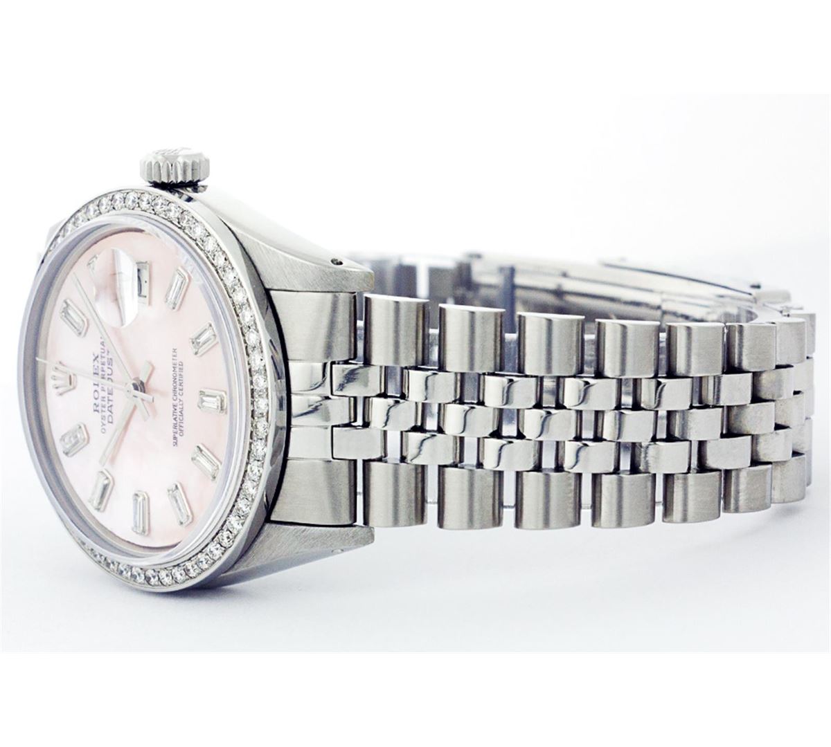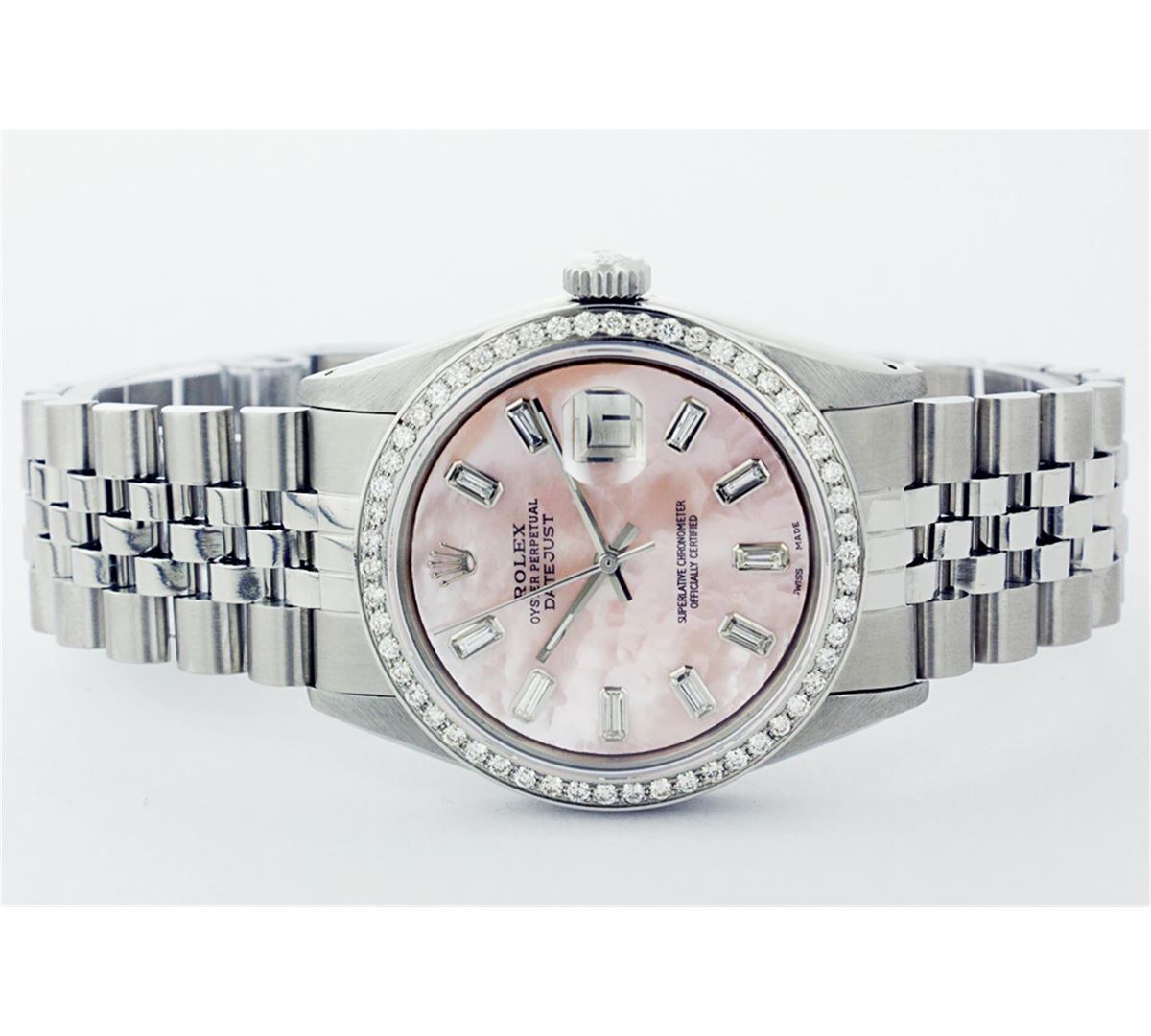 One Gents Rolex Datejust Polished, Serviced & Electronically Tested, Stainless Steel Case:36mm, Stainless Steel Crown, Custom Bezel: Stainless Steel Beadset Diamond Bezel, Diamond Count: 54 Diamonds, Total Weight 1.00 Carat, Clarity: SI-VS, Color: G to H. Custom Crystal: Synthetic Sapphire Cyclops Lens. Movement: Automatic Winding Movement Caliber 3035. Custom Dial: Pink Mother Of Pearl Baguette Diamond Dial, Diamond Count: 10 Baguette Diamonds Dial, Clarity: SI-VS, Color: G to H. Date Window: 3 O'Clock Position Date Display, Quickset, Model: 16014 Condition: G-6 Extra Fine. Bracelet: Stainless Steel Jubilee. Bright Polish & Satin Finish. 6.5 Inch Length, Adjustable. Standard Clasp, With Rolex Logo.