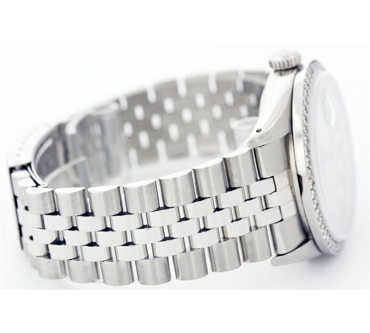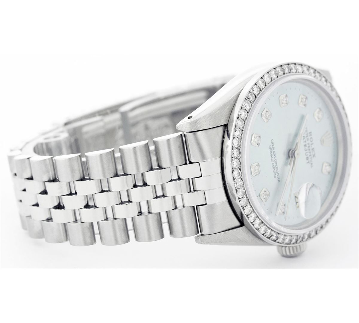One Gents Rolex Datejust Polished, Serviced & Electronically Tested, Stainless Steel Case:36mm, Stainless Steel Crown, Custom Bezel: Stainless Steel Beadset Diamond Bezel, Total Weight: 1 Carat, Diamond Count: 54 Diamonds, Clarity: SI-VS, Color: G to H. Custom Crystal: Synthetic Sapphire Cyclops Lens. Movement: Automatic Winding Movement Caliber 3035. Custom Dial: Ice Blue With Diamond Hour Markers, Diamond Count: 10 Diamonds, Clarity: SI-VS, Color: G To H. Date Window: 3 O'Clock Position Date Display, Quickset, Model: 16014 Condition: G-6 Extra Fine. Bracelet: Stainless Steel Jubilee. Bright Polish & Satin Finish. 6.5 Inch Length, Adjustable. Standard Clasp, With Rolex Logo.