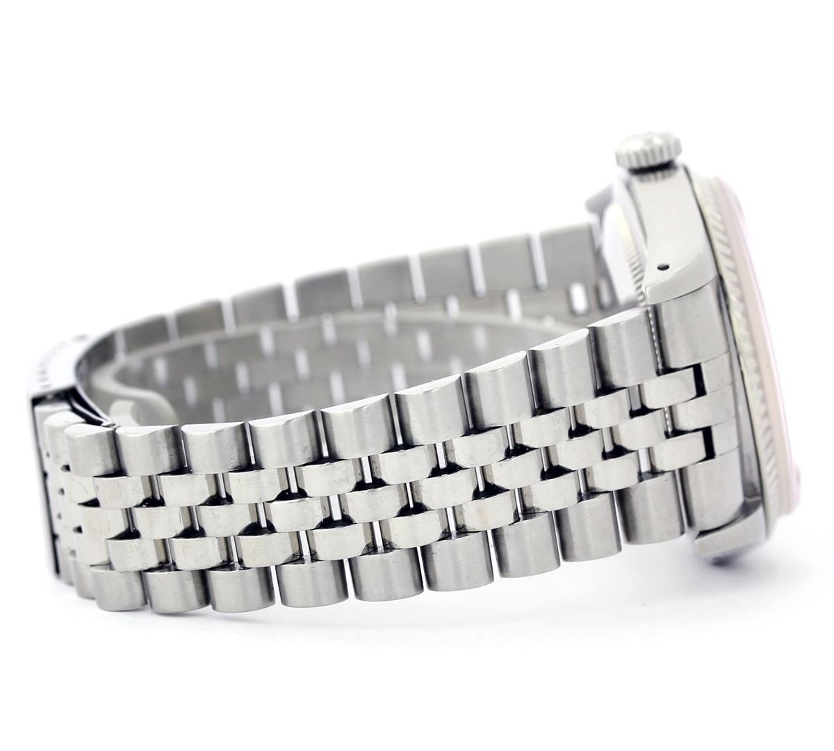 One Gents Rolex Datejust Polished, Serviced & Electronically Tested, Stainless Steel Case:36mm, Stainless Steel Crown, Custom Bezel: 18K White Gold Fluted Bezel. Custom Crystal: Synthetic Sapphire Cyclops Lens. Movement: Automatic Winding Movement Caliber 3035. Custom Dial: Red Diamond Dial, Diamond Count: 10 Diamonds, Clarity: SI-VS, Color: G to H. Date Window: 3 O'Clock Position Date Display, Quickset, Model: 16014 Condition: G-6 Extra Fine. Bracelet: Stainless Steel Jubilee. Bright Polish & Satin Finish. 6.5 Inch Length, Adjustable. Standard Clasp, With Rolex Logo.