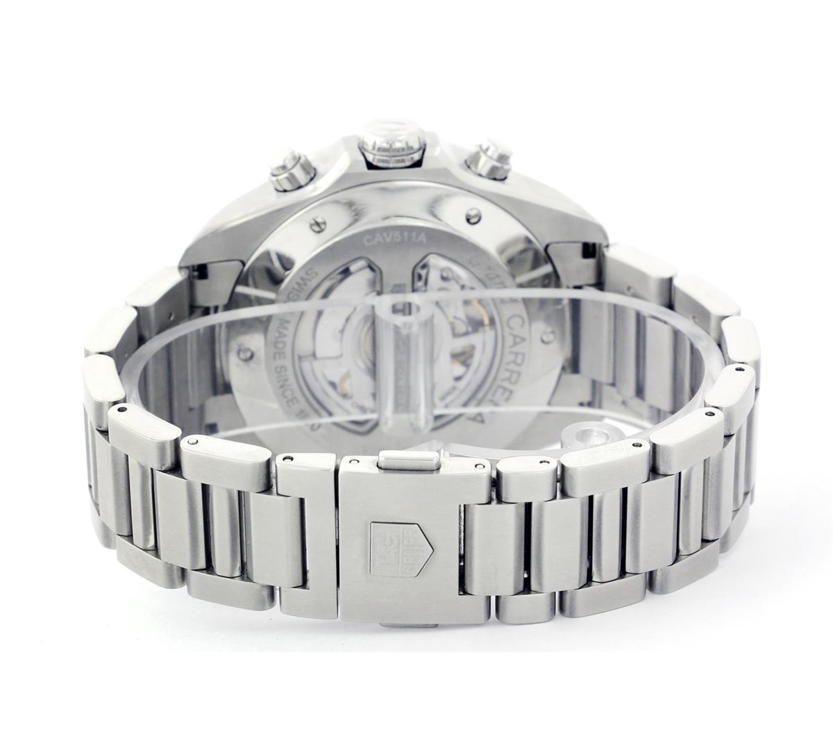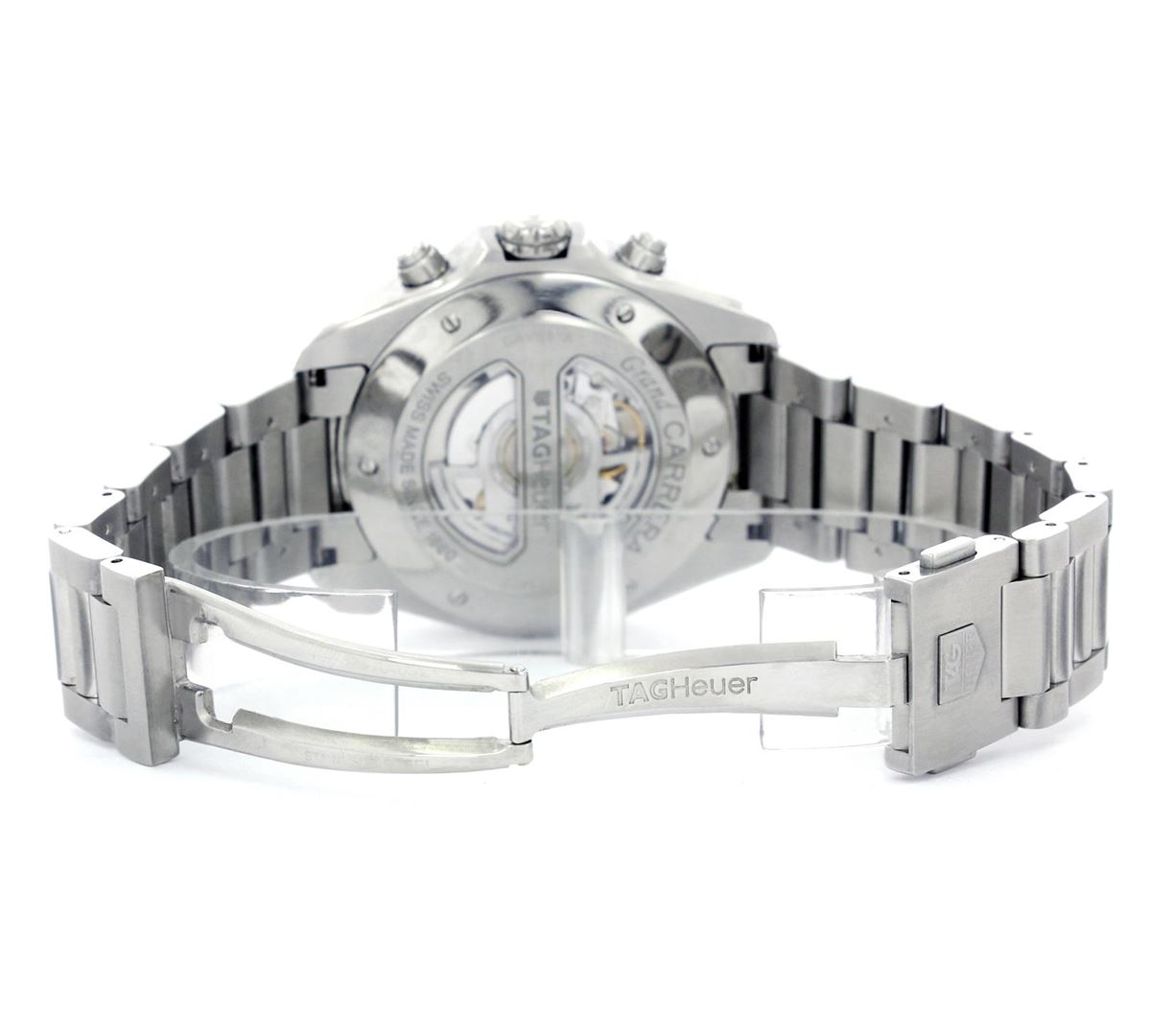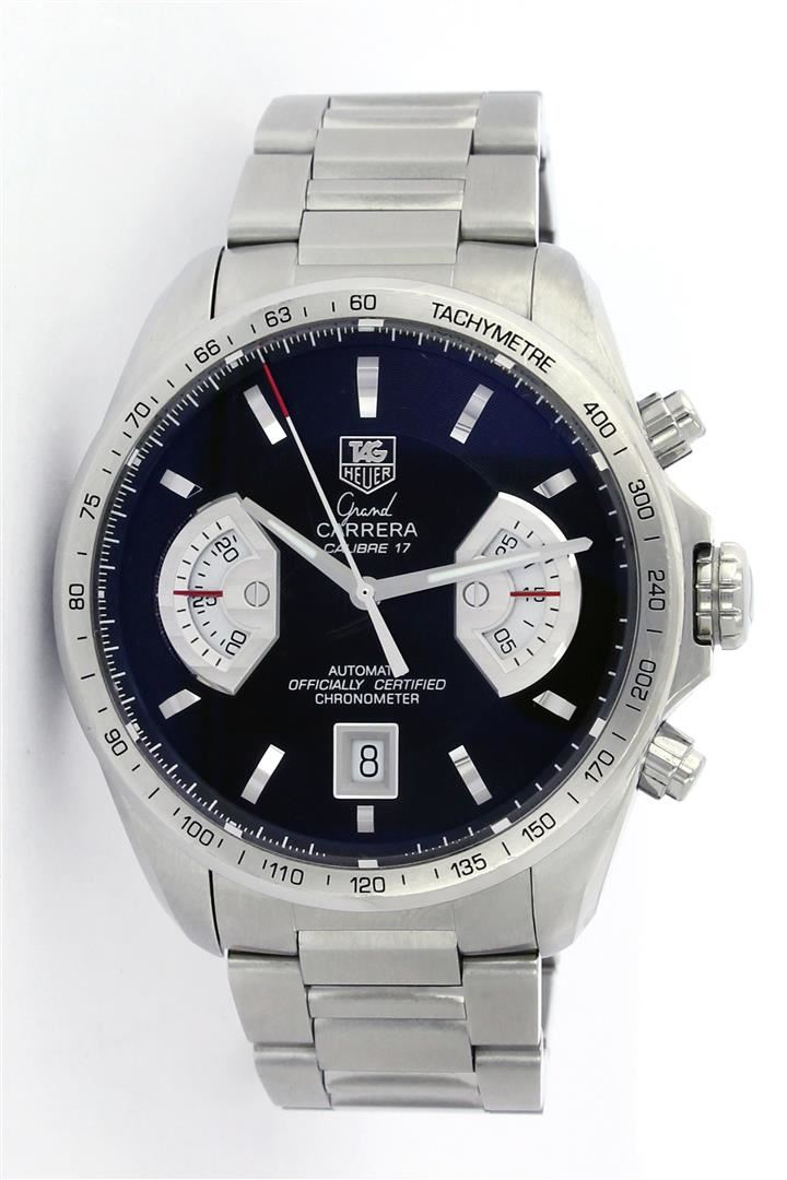 One Gents Stainless Steel Grand Carrera Calibre 17, Serviced & Electronically Tested, Case:48mm, Stainless Steel Crown, Bezel: Stainless Steel Bezel, Crystal: Sapphire Lens. Movement: Automatic Winding Movement. Dial: Black Dial With Index Hour Markers and Two Sub Dial, Date window at 6 O'Clock position. Model# Cav511A Condition: G-8 Mint. Bracelet: Stainless Steel 7.5 Inch Length, Adjustable. Standard Clasp, With Tag Heuer Clasp Mark.