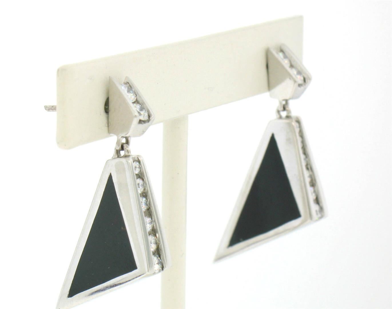 Geometric 18K White Gold Graduated Diamond Black Onyx Inlay Dangle Earrings. Please see photos and description for all available information. An estate solid 18k white gold geometric dangle earrings, faeturing inlaid black onyx and 16 round brilliant cut natural diamonds (F- VS1 ; 0.70ctw). The earrings measure approximately 32.64x4.48mm and weigh a total of 10.20 grams.