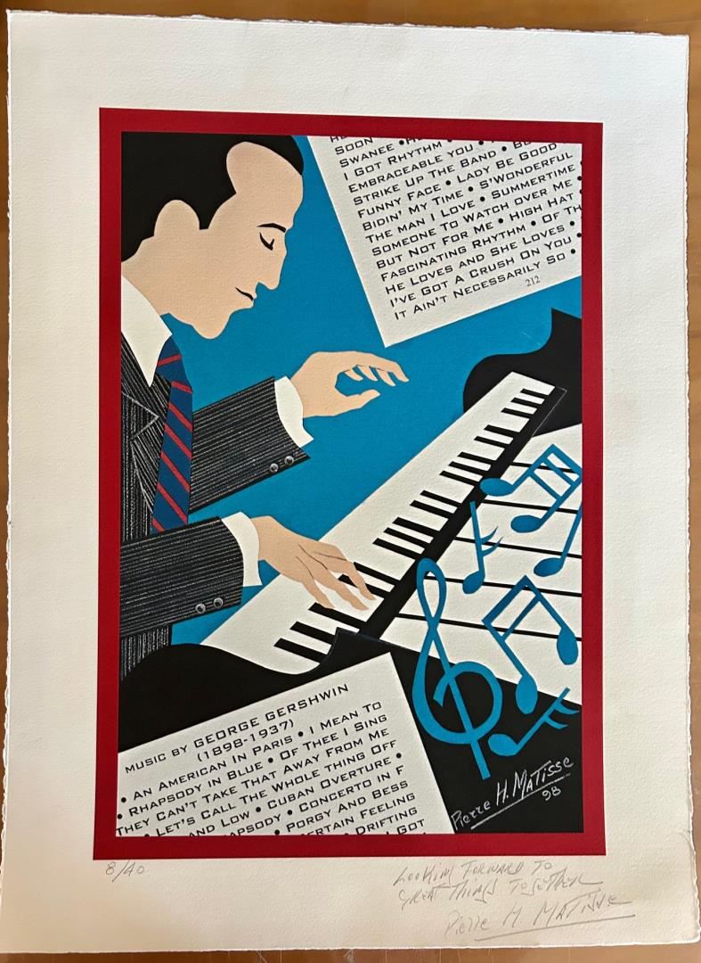 Pierre Matisse, grandson of Henrie Mattise, created this small edition of 40 pieces as an homage to the great composer George Gershwin. It measures 21.25"x16 on paper.