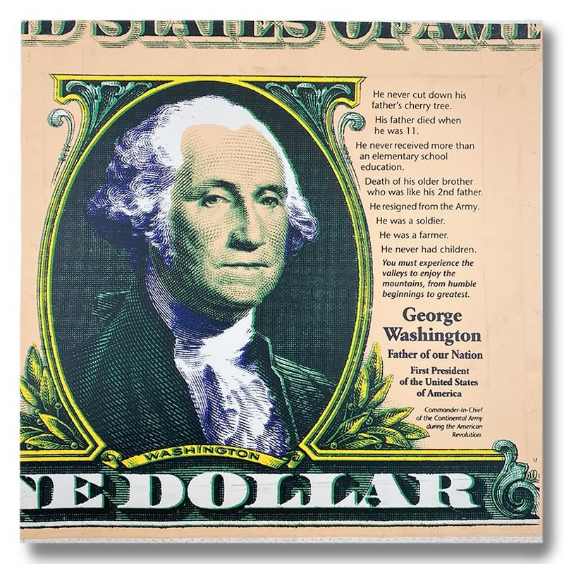 "George Washington, Father of Our Nation " is a limited edition hand pulled silkscreen mixed media on canvas by Andy Warhol protege Steve Kaufman (1960-2010). This piece is numbered and AP 4/50 and hand signed inverso. Includes letter of authenticity. As is common with Kaufman's works, this piece may have perceived minor flaws, but is in overall good condition. Measures approximately 26" x 25.5" (image).