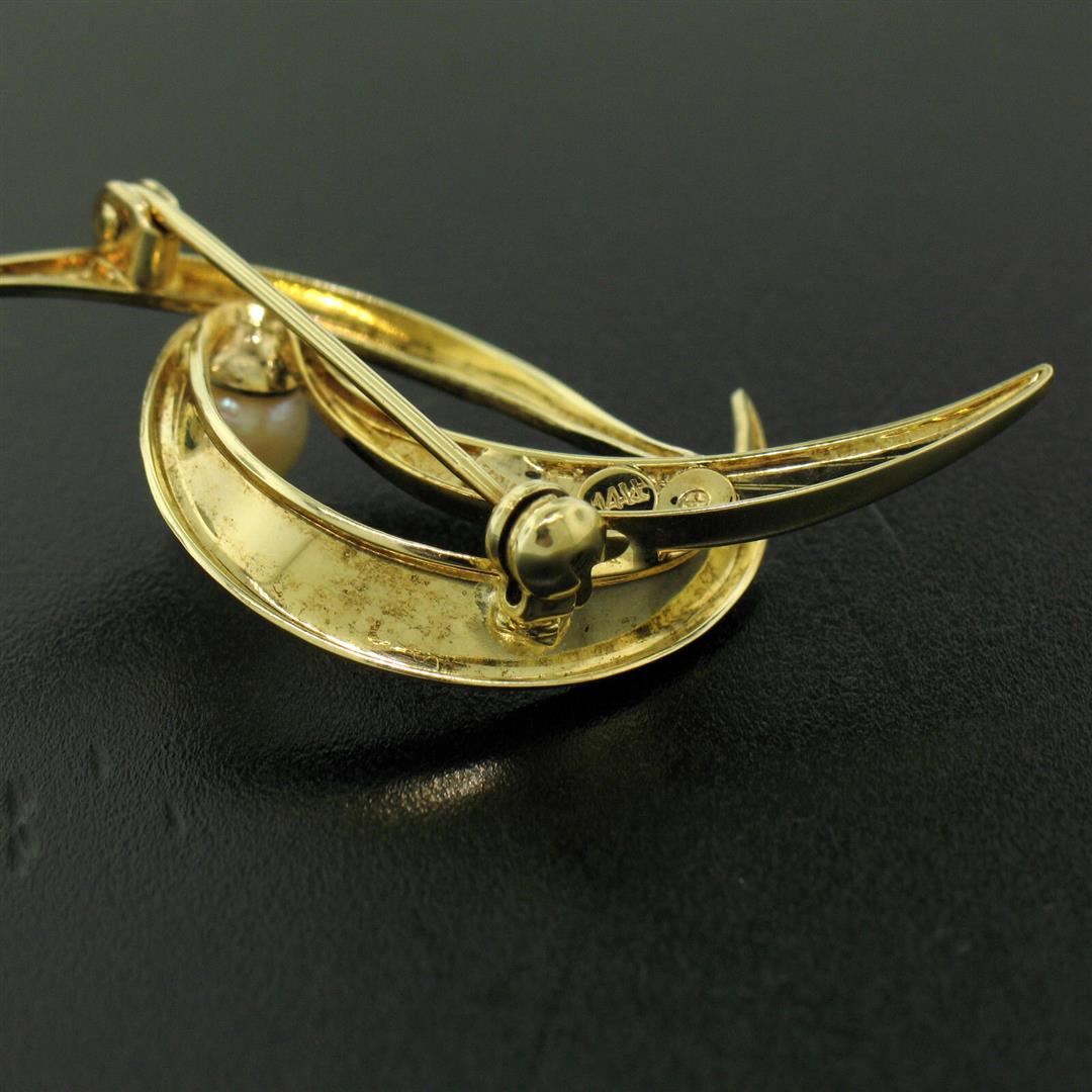 An estate german solid 14k yellow gold pin brooch featuring 1 natural cultured pearl (5.90mm ). Measures 33.3x29.5mm and weighs a total of 4.7 grams.
