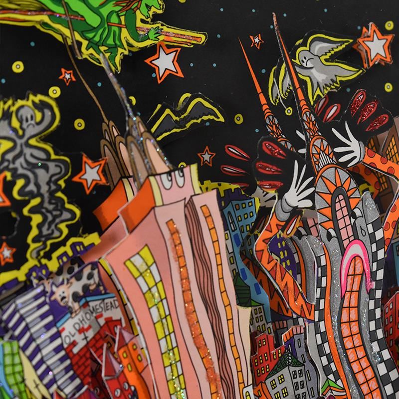 "Ghost, Good Times and Gridlock (Yellow)" is a 3D limited edition silk screen construct on paper by Charles Fazzino, numbered and hand signed by the artist. This piece comes custom framed. Includes Certificate of Authenticity. Measures approximately 24" x 18" (frame), 16" x 10" (image).