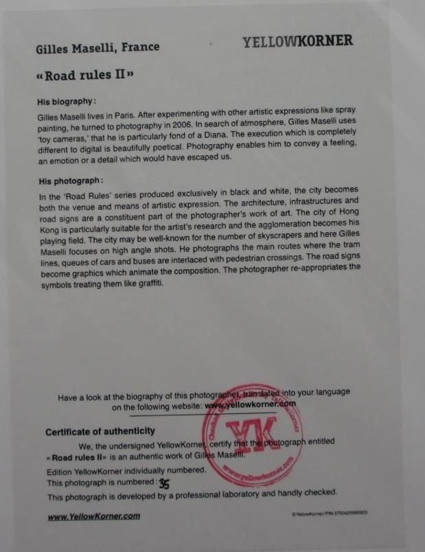 Road Rules II Certified Photograph, Gilles Maselli YellowKorner Certified Photograph. Certificate of Authenticity from YellowKorner affixed to the back. Matted Dimensions 16"x20". Protected with Clear Mylar Sleeve.
