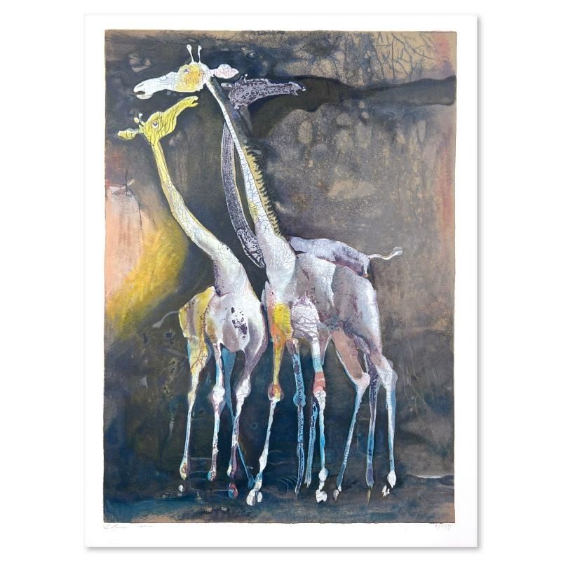 "Giraffes" is a limited edition serigraph on paper by Edwin Salomon (1935-2014). The piece comes hand signed by the artist numbered and with a letter of authenticity. Measures approximately 26.5" x 19".