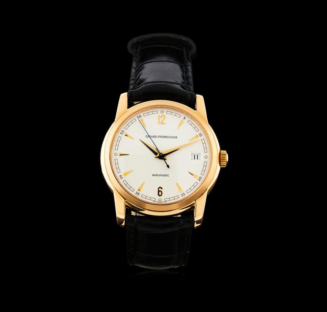 One, Girard Perregaux La Chaux-de-Fonds wristwatch electronically tested 18KT pink gold, Swiss Hallmarked Case: 36mm diameter, Water Resistant: 30 meters / 100 feet, Case Back: synthetic sapphire exhibition crystal, secured with six inset screws, the frame is engraved with the manufacturers name, and ID numbers, Crown: scalloped, Fixed Bezel: satin polish finish, Crystal: synthetic sapphire lens. Movement: Girard Perregaux automatic, 27 jewel Swiss mechanical, 42 Hour Power Reserve, Girard Perregaux signed Dial: with luminous pointed hands and indices. Date Window: 3 o'clock position, Bracelet: saddle stitched leather strap, Condition: G-6 Extra Fine. Eight and one quarter inch length, adjustable. Swiss Hallmarked Girard Perregaux 18KT pink gold buckle. Total Weight of Watch 53.34gm. AIG Appraised at $11,000.00.