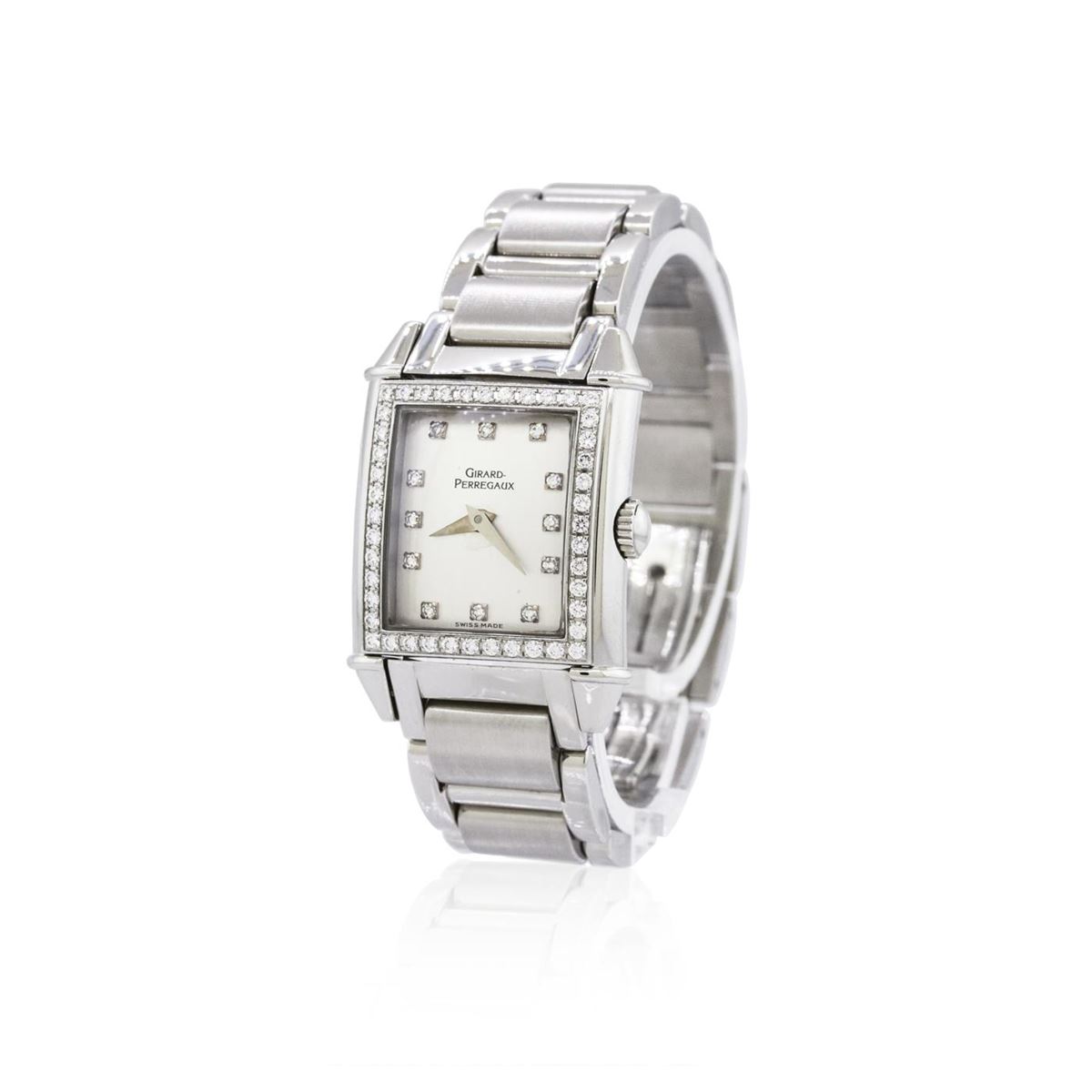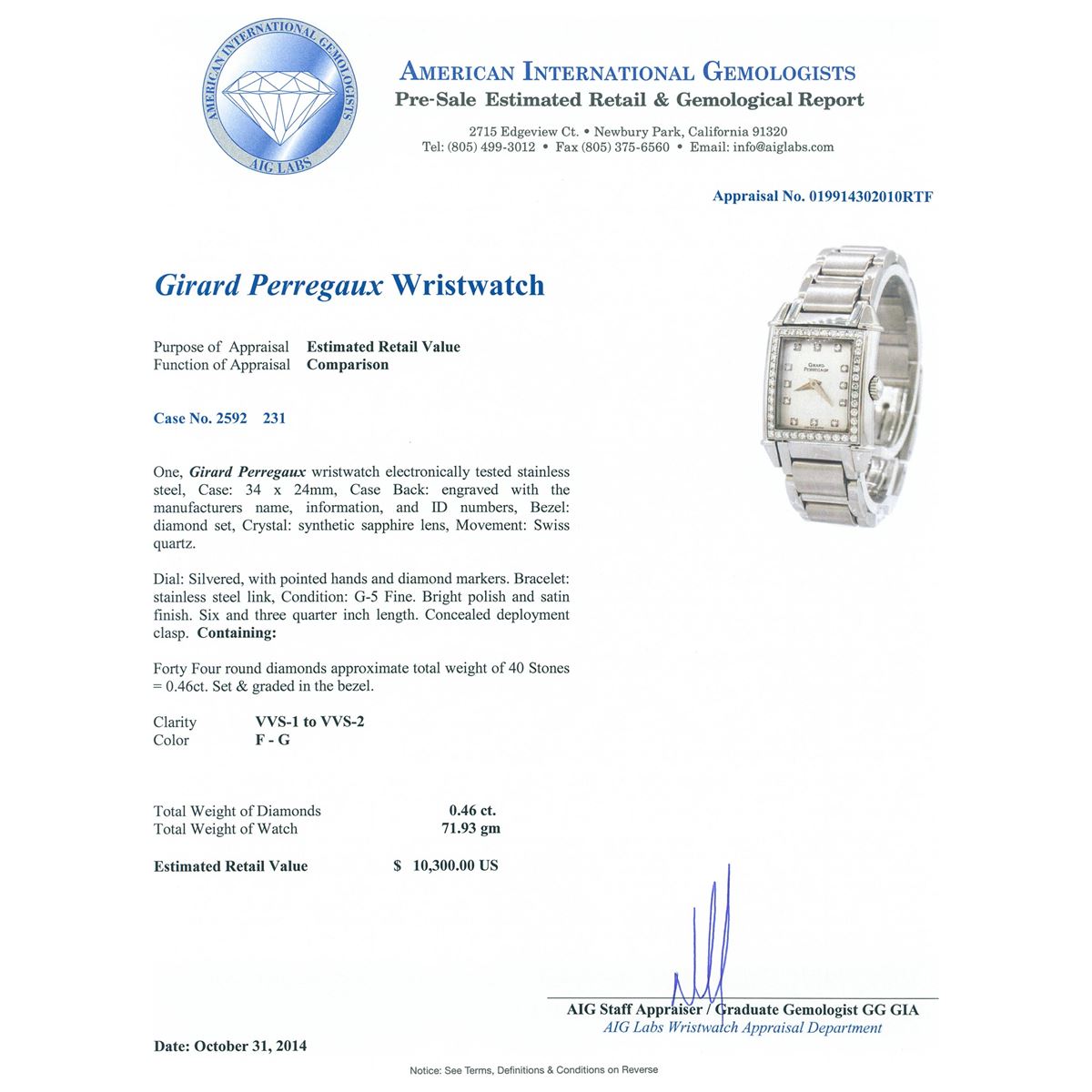 One, Girard Perregaux wristwatch electronically tested stainless steel, Case: 34 x 24mm, Case Back: engraved with the manufacturers name, information, and ID numbers, Bezel: diamond set, Crystal: synthetic sapphire lens, Movement: Swiss quartz. Dial: Silvered, with pointed hands and diamond markers. Bracelet: stainless steel link, Condition: G-5 Fine. Bright polish and satin finish. Six and three quarter inch length. Concealed deployment clasp. Containing: Forty Four round diamonds approximate total weight of 40 Stones = 0.46ct. Set & graded in the bezel. Clarity: VVS-1 to VVS-2. Color: F - G. Total Weight of Diamonds 0.46ct. Total Weight of Watch 71.93 grams. AIG Appraised at $10,300.00.