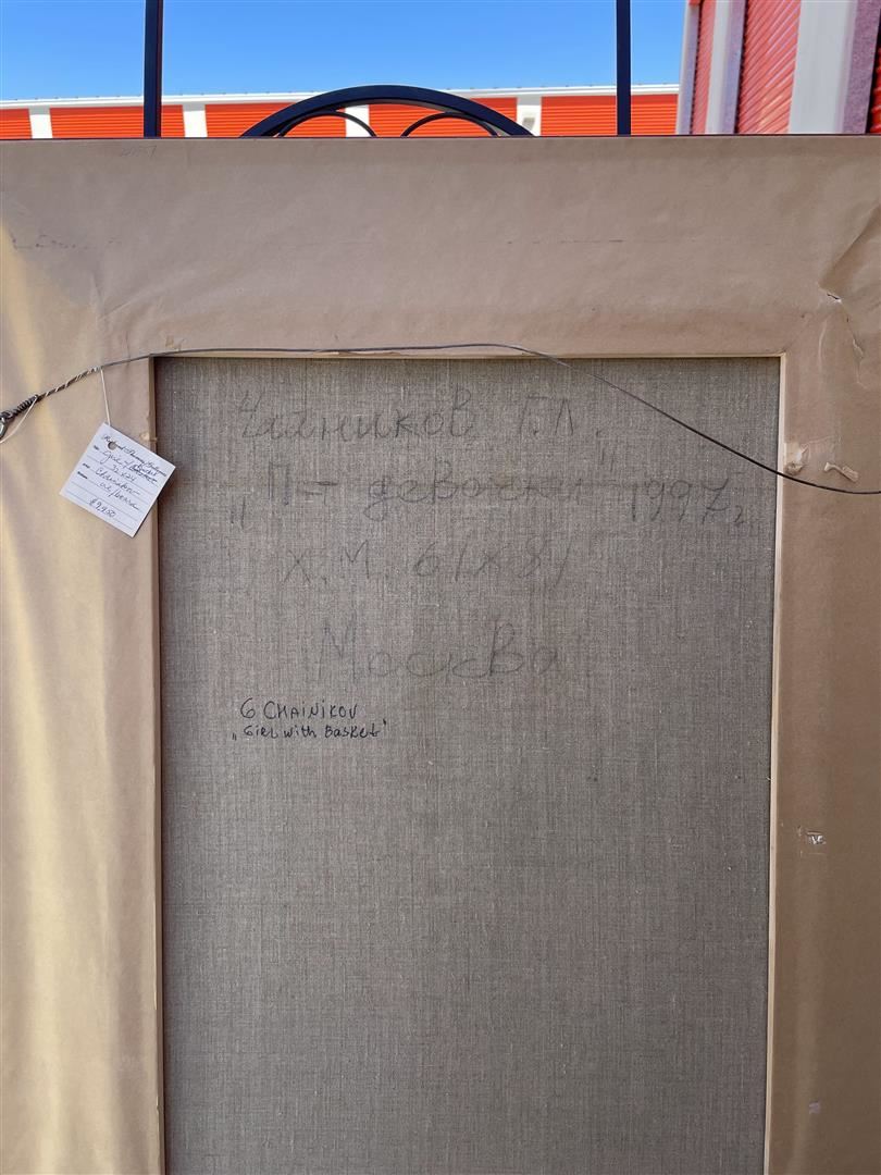 Grigoriy Chainikov captures the mood of a sad, young Russian girl, sitting barefoot by a work bucket in this oil on board. The painting measures 32 x 24; framed image measures approx. 44 x 36.