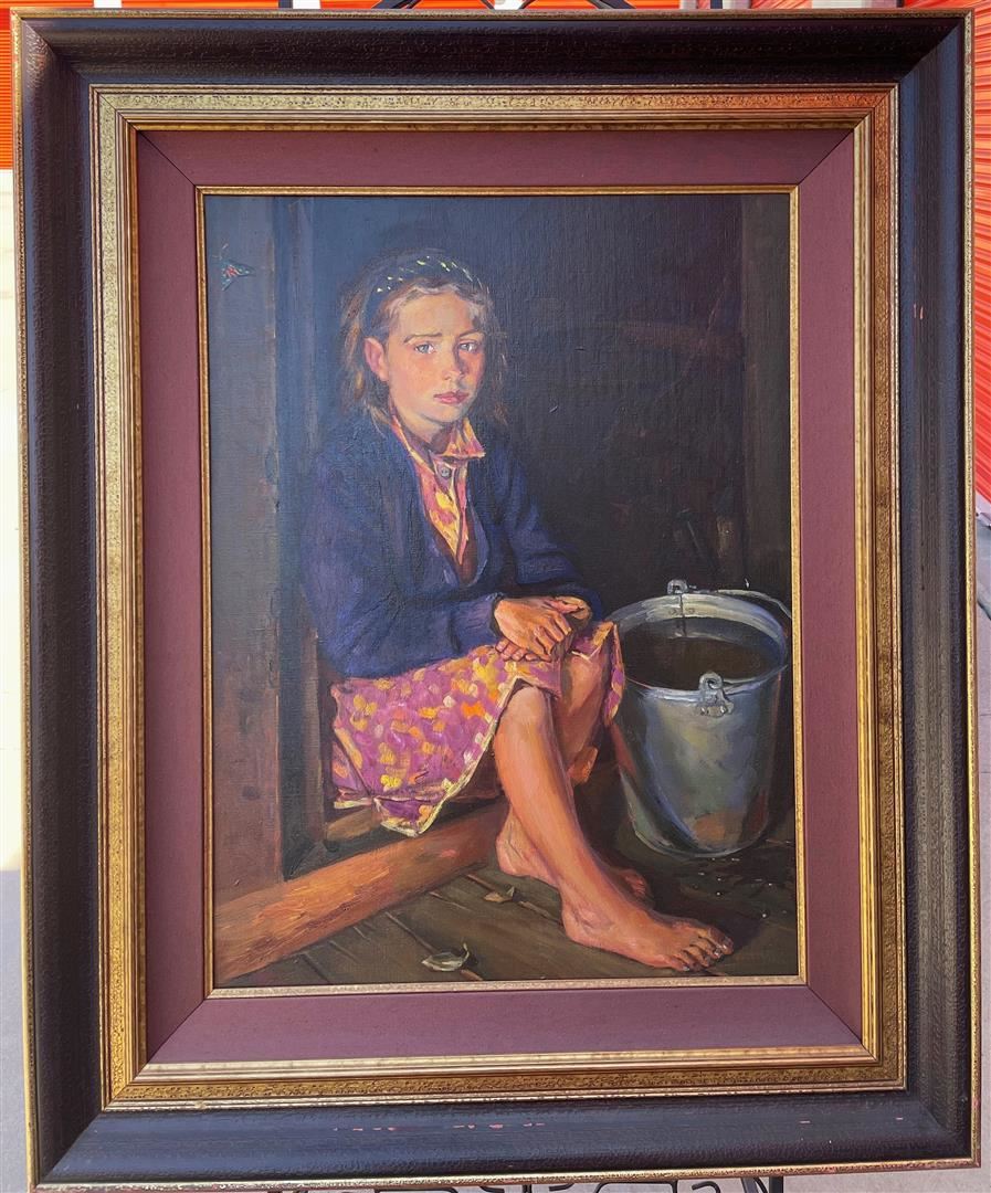 Grigoriy Chainikov captures the mood of a sad, young Russian girl, sitting barefoot by a work bucket in this oil on board. The painting measures 32 x 24; framed image measures approx. 44 x 36.