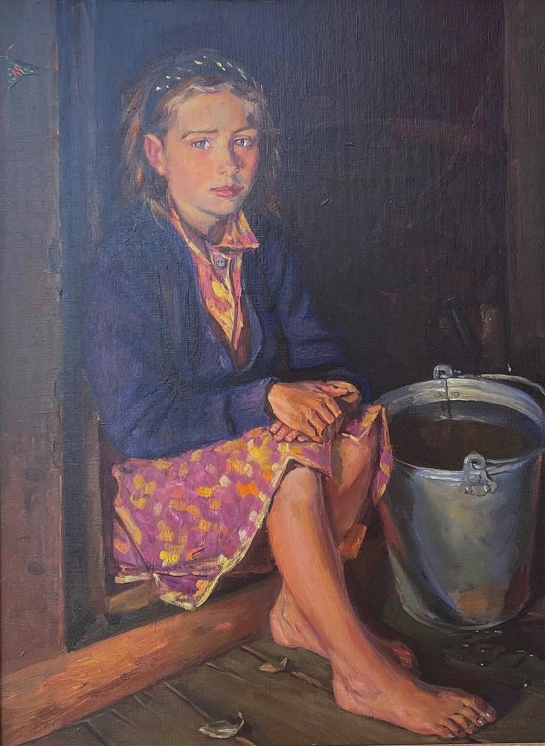 Grigoriy Chainikov captures the mood of a sad, young Russian girl, sitting barefoot by a work bucket in this oil on board. The painting measures 32 x 24; framed image measures approx. 44 x 36.