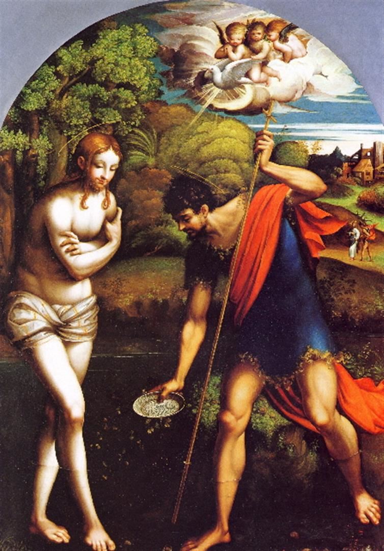Artist: Girolamo Francesco Maria Mazzola(Parmigianino) - Title: Baptism of Christ - Medium: Fine Art Giclee on Canvas - Image Size: Approximately 32 inches x 22.5 inches - Unframed on Unstretched Canvas - Biography: Girolamo Francesco Maria Mazzola (11 January 1503 - 24 August 1540), also known as Francesco Mazzola or, more commonly, as Parmigianino, which is Italian for "the little one from Parma", was an Italian Mannerist painter and printmaker active in Florence, Rome, Bologna, and his native city of Parma. His work is characterized by a "refined sensuality" and often elongation of forms and includes Vision of Saint Jerome (1527) and the iconic if somewhat untypical Madonna with the Long Neck (1534), and he remains the best known artist of the first generation whose whole careers fall into the Mannerist period.