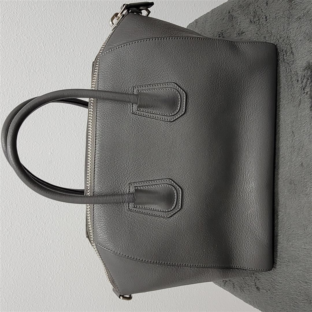 One Givenchy Antigone Medium Leather Satchel. This is an authentic GIVENCHY Sugar Goatskin Medium Antigona in Pearl Grey. This elegant model is crafted of luxuriously grained grey goatskin leather with rolled-leather top handles and a flat leather shoulder strap with silver hardware. The top zipper opens to a black fabric interior with zipper and patch pockets.