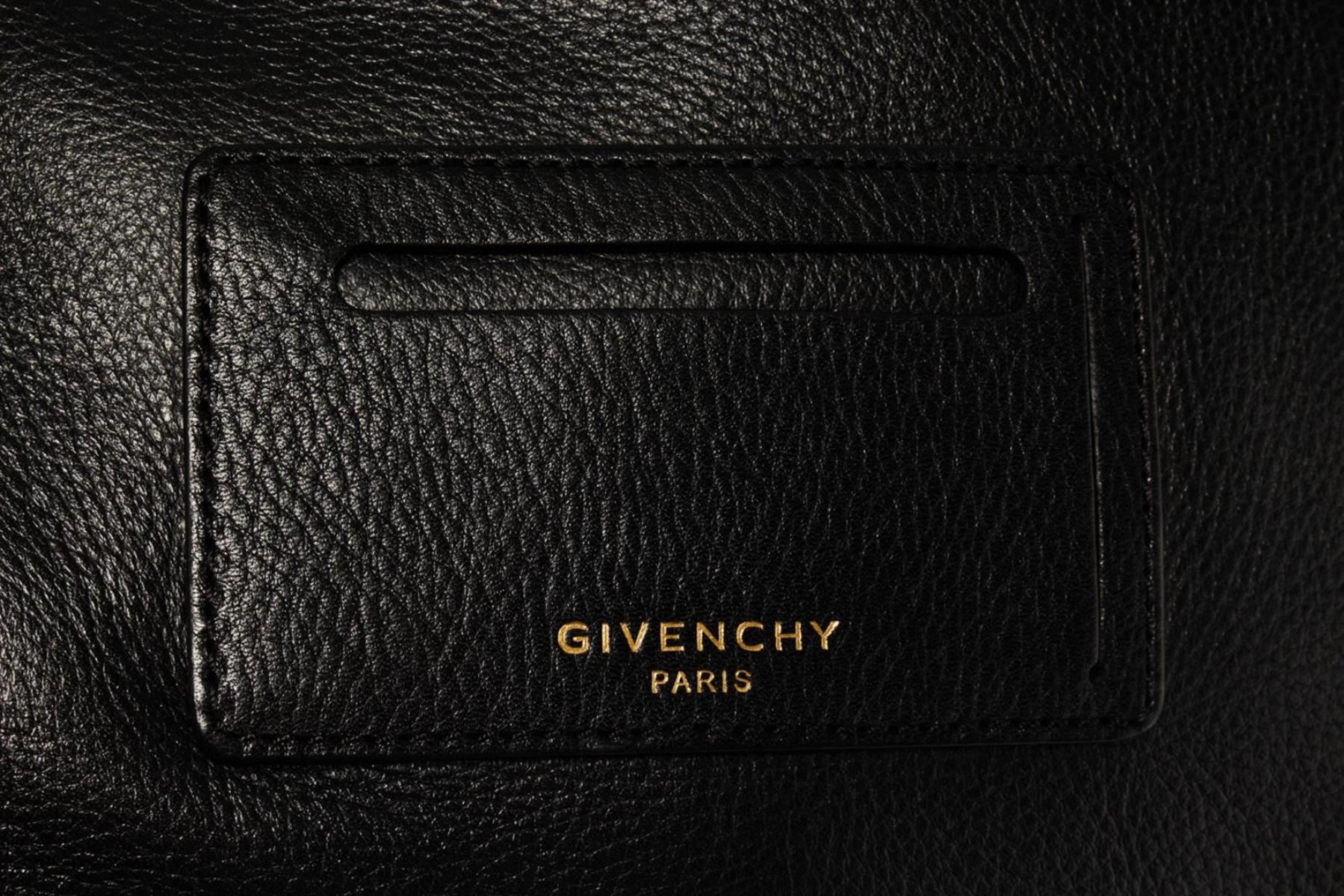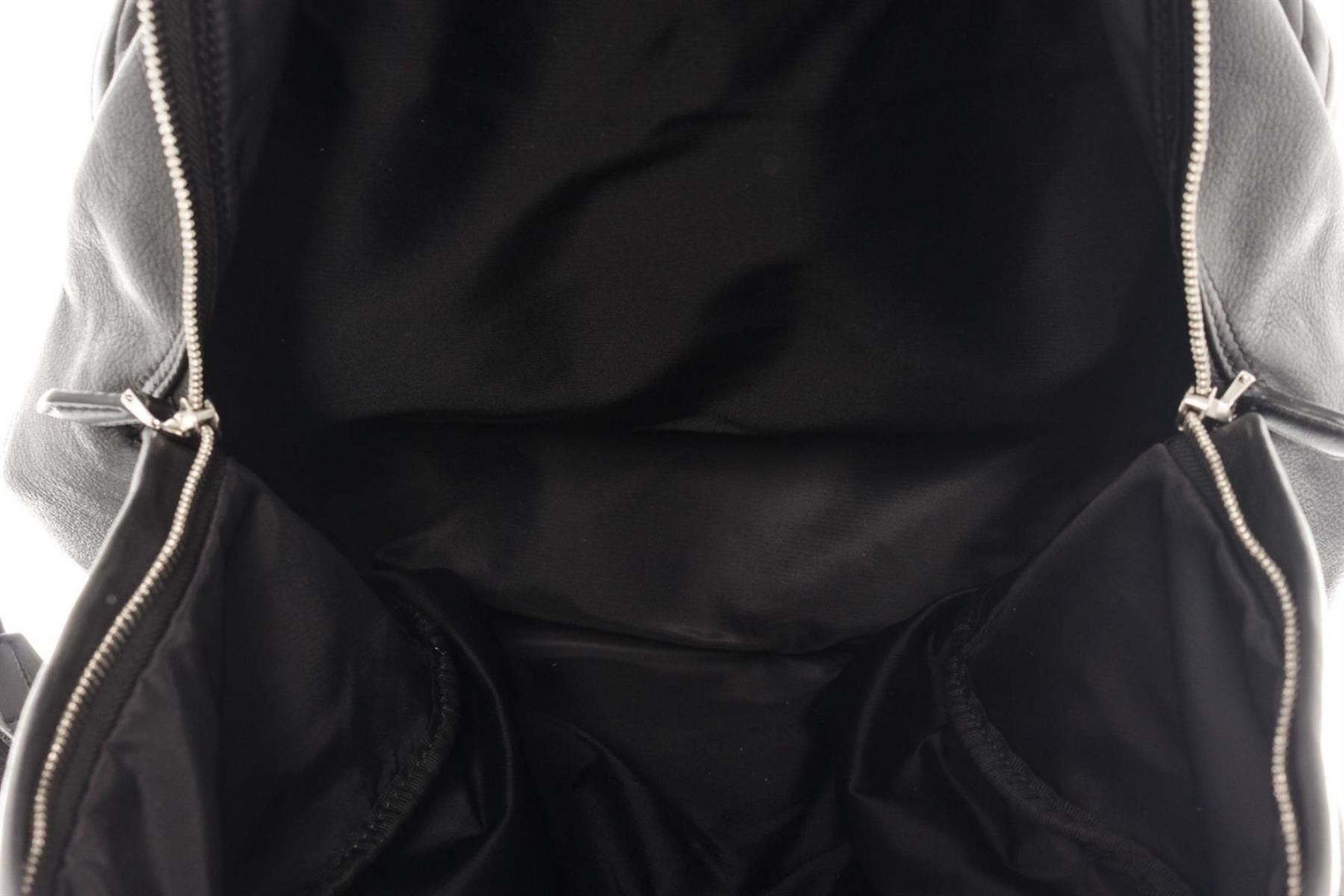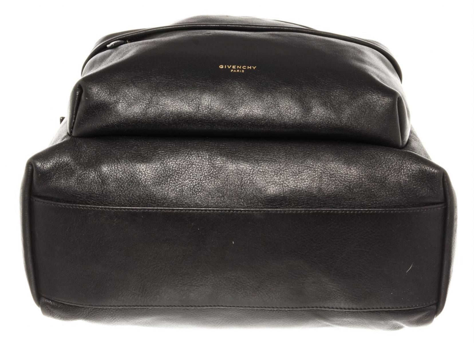 Black leather Givenchy Logo backpack with silver-tone hardware, single flat handle, dual flat studded shoulder straps, tonal leather trim, single exterior zip pocket, tonal woven lining, single interior slip pocket and two-way zip closure at top. Heigh