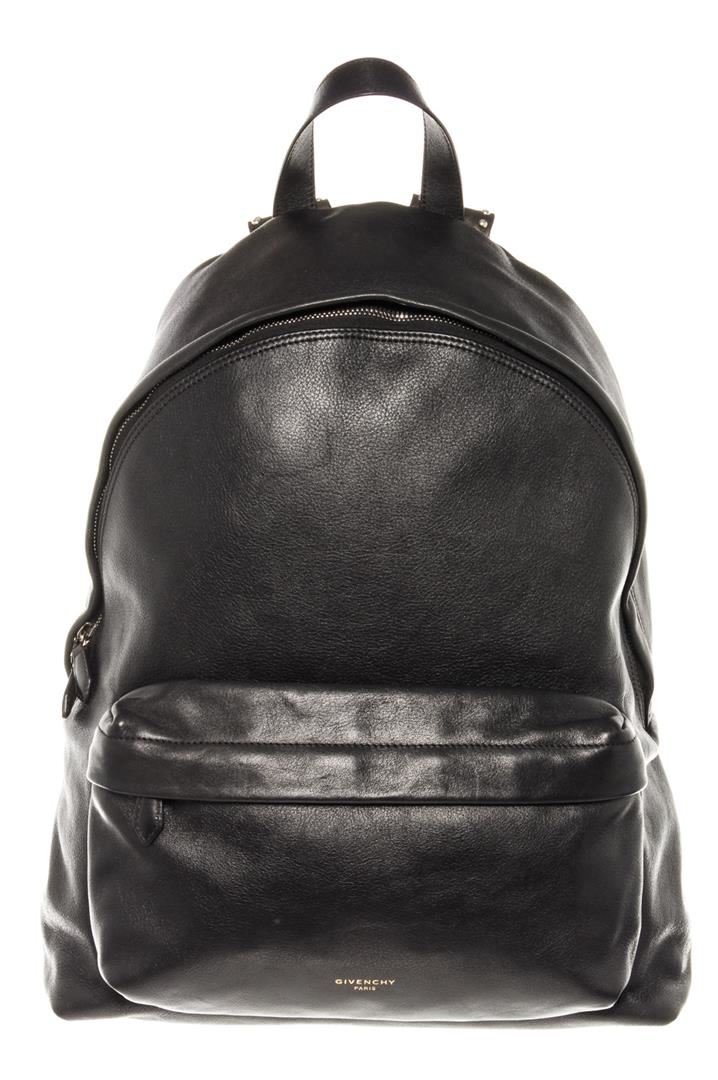 One Givenchy Black Leather Logo Studs Backpack. Item is sold AS-IS. All available information is listed in the description and shown in the photo. Black leather Givenchy Logo backpack with silver-tone hardware, single flat handle, dual flat studded shoulder straps, tonal leather trim, single exterior zip pocket, tonal woven lining, single interior slip pocket and two-way zip closure at top. Height: 13.5" Width: 9.5" Depth: 3.25" Shoulder Strap Length: 13" Handle Drop: 2.5"