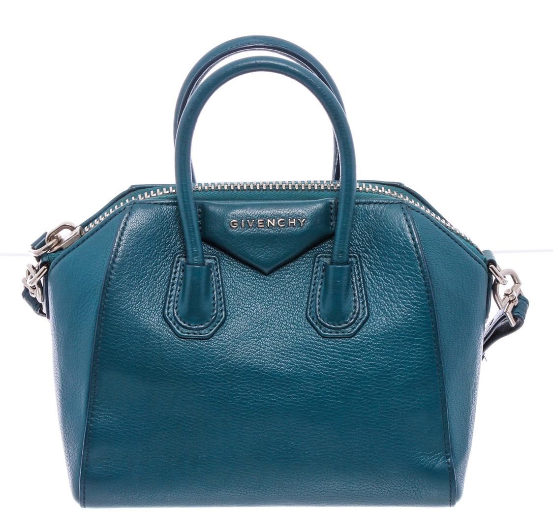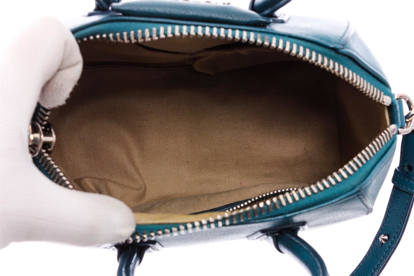 Givenchy Blue Grained Leather Mini Antigona Tote Bag. All available information is listed in the description and shown in the photos. Givenchy blue grained leather Mini Antigona bag with silver-tone hardware, beige canvas lining, two interior slip pockets, interior zip pocket, optional leather crossbody shoulder strap, and zip top closure.