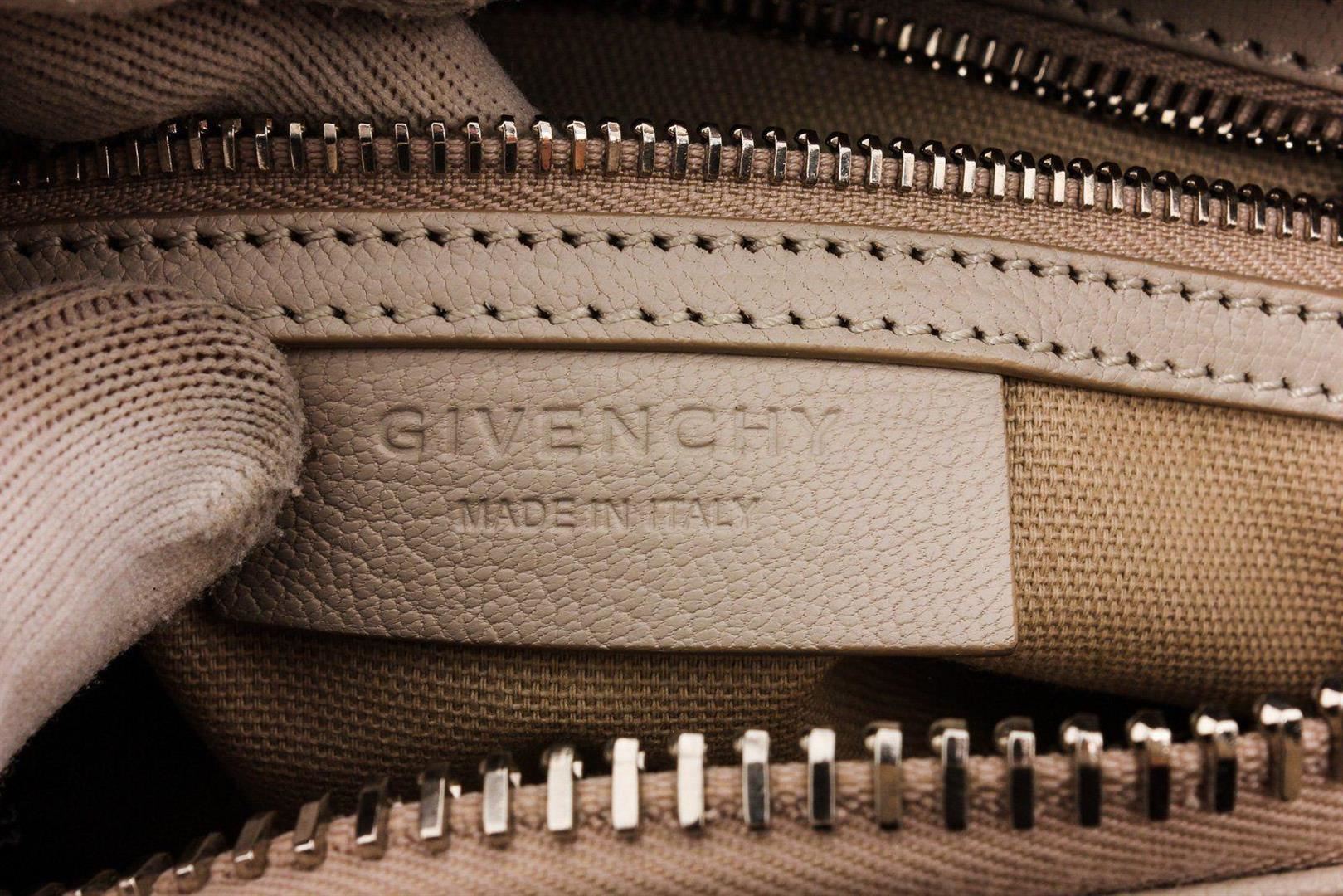 Cream leather Givenchy Mini Antigona satchel with silver-tone hardware, dual rolled top handles, detachable flat shoulder strap, logo adornment at front, protective feet at base, beige canvas lining, three pockets at interior; one with zip closure and zip closure at top. Measurements: Length: 8.5 in / 22 cm Width: 5.25 in / 13 cm 7.5 in / 19 cmCONDITION: Pre-Owned Good Condition Overall. Please see photographs.