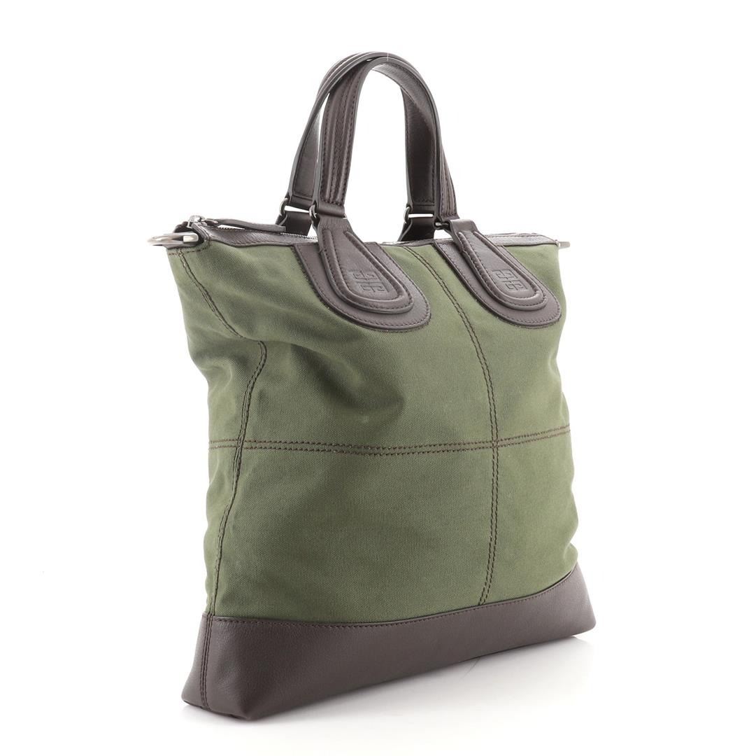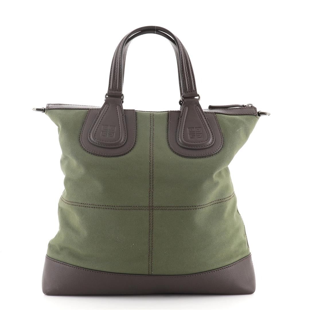 One Givenchy Nightingale Flat Shopper Tote Canvas with Leather Brown, Green. Item is sold AS-IS. All available information is listed in the description and shown in the photo. Givenchy Nightingale Flat Shopper Tote Canvas with Leather Brown, Green Condition Details: Minor scuffs and wear on leather trims and handles, light marks on exterior, wear on base corners, scratches on hardware. Height 15", Width 14.5", Depth 3", Strap Drop 12-22