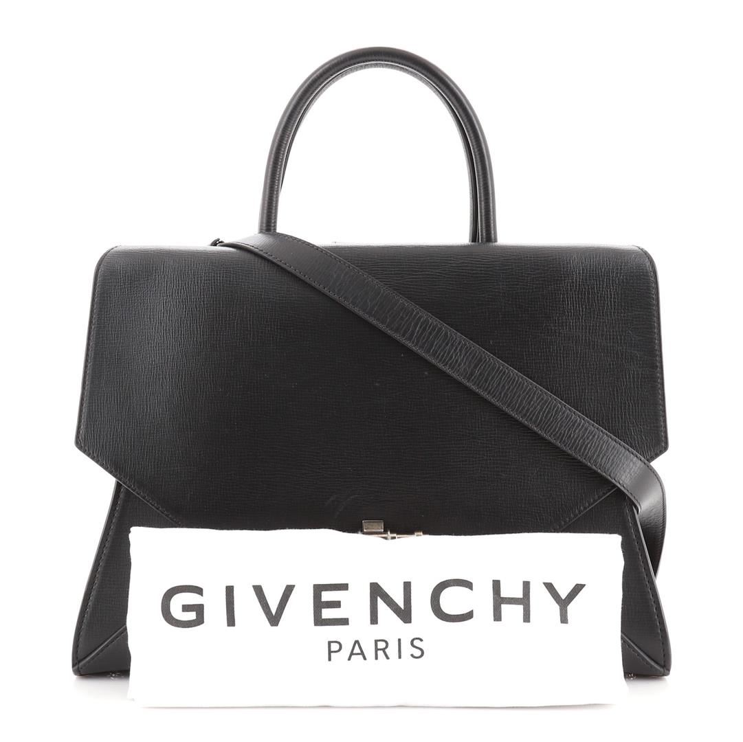 Givenchy Obsedia Satchel Leather Medium Black Condition Details: Scuffs and indentations on exterior, underneath flap and in interior, minor cracking on handle wax edges near base. Wear in interior, scratches and discoloration on hardware. 5 Heig