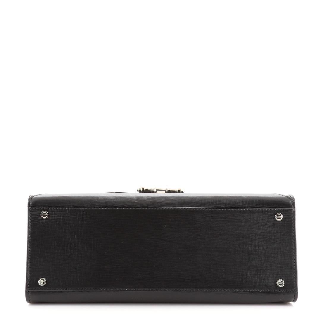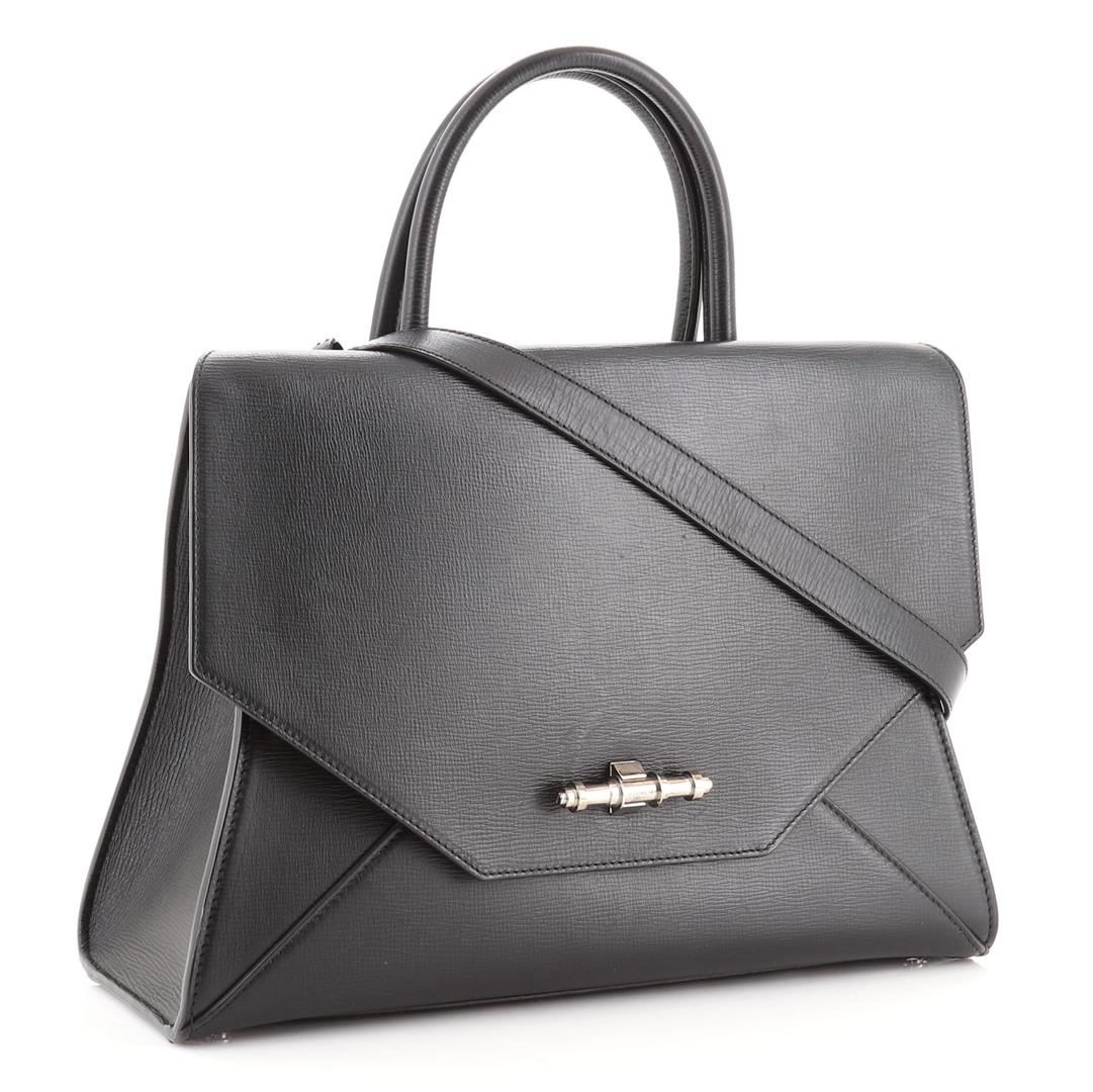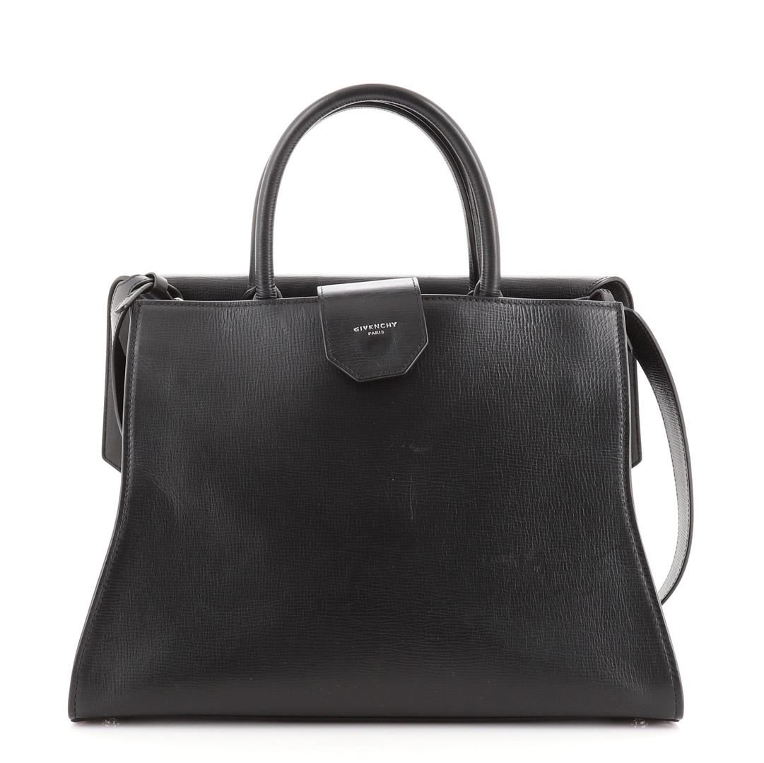 Givenchy Obsedia Satchel Leather Medium Black Condition Details: Scuffs and indentations on exterior, underneath flap and in interior, minor cracking on handle wax edges near base. Wear in interior, scratches and discoloration on hardware. 5 Heig