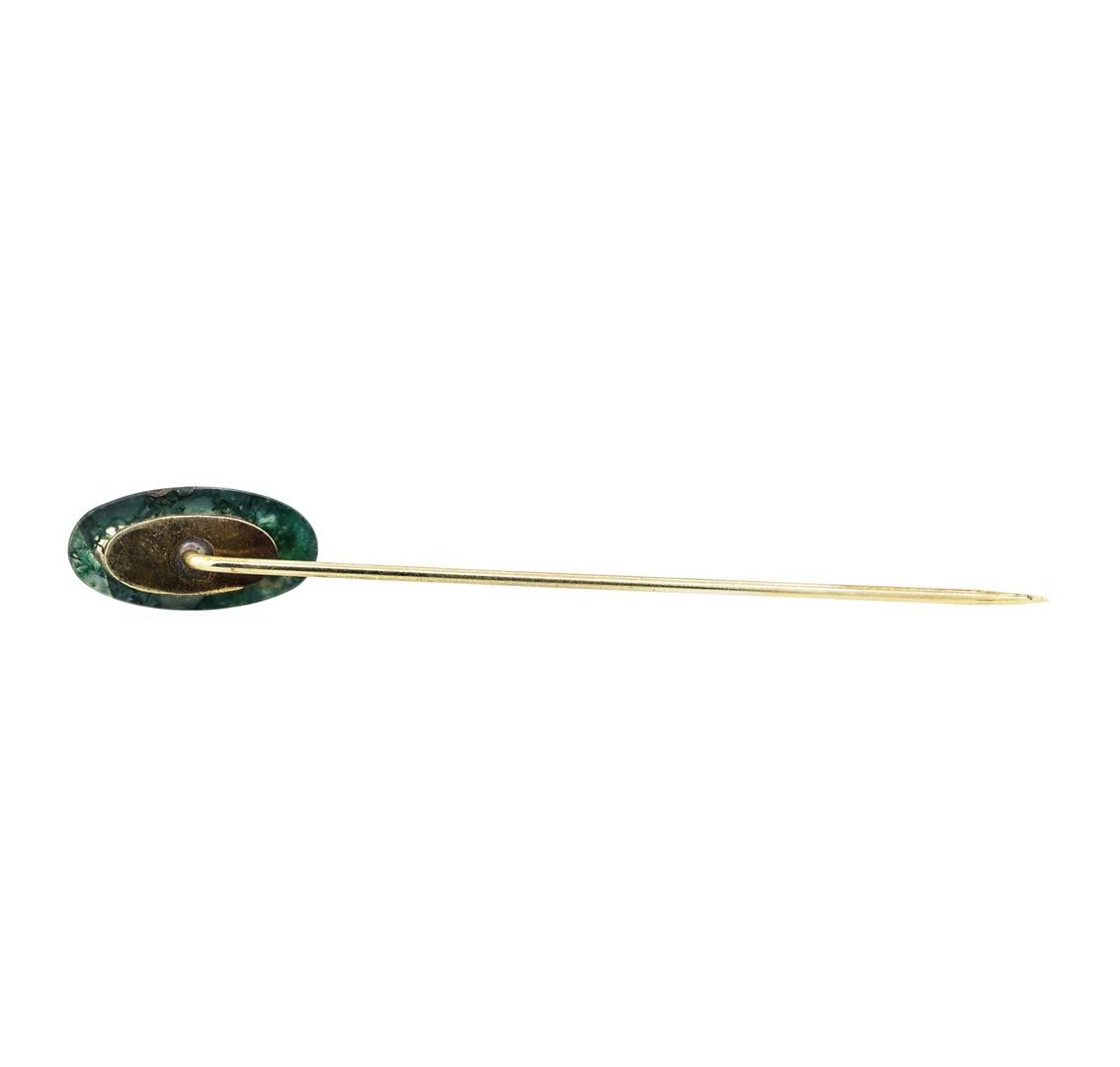 One pewter stick pin weighing 2.2 grams featuring one oval cabochon green piece of glass.